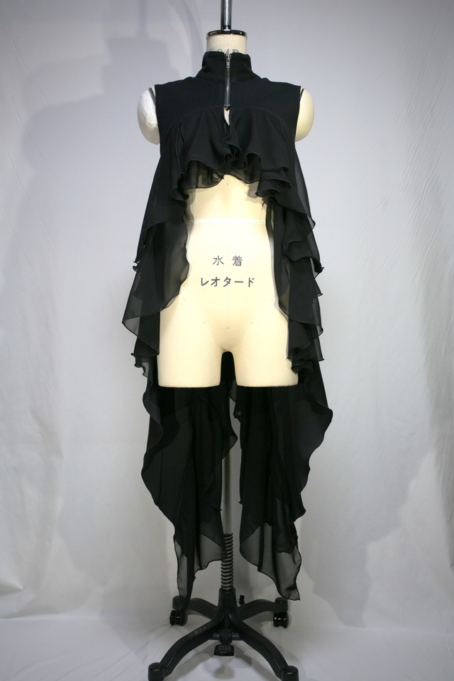 丈30~124・上胸88 ★トルソーのサイズ バスト82・ウエスト61.5・ヒップ89 ※全てcm 前中心で12㎝オープンファスナー開きになっています。 後中心のスリットには、ハトメを開けて編み上げになっています。 フリル布には、透け感のあるジョーゼットを使っています。 フリル布周囲と裾は巻きロック始末になっています。 表生地・フリル布共に、ポリエステル100%