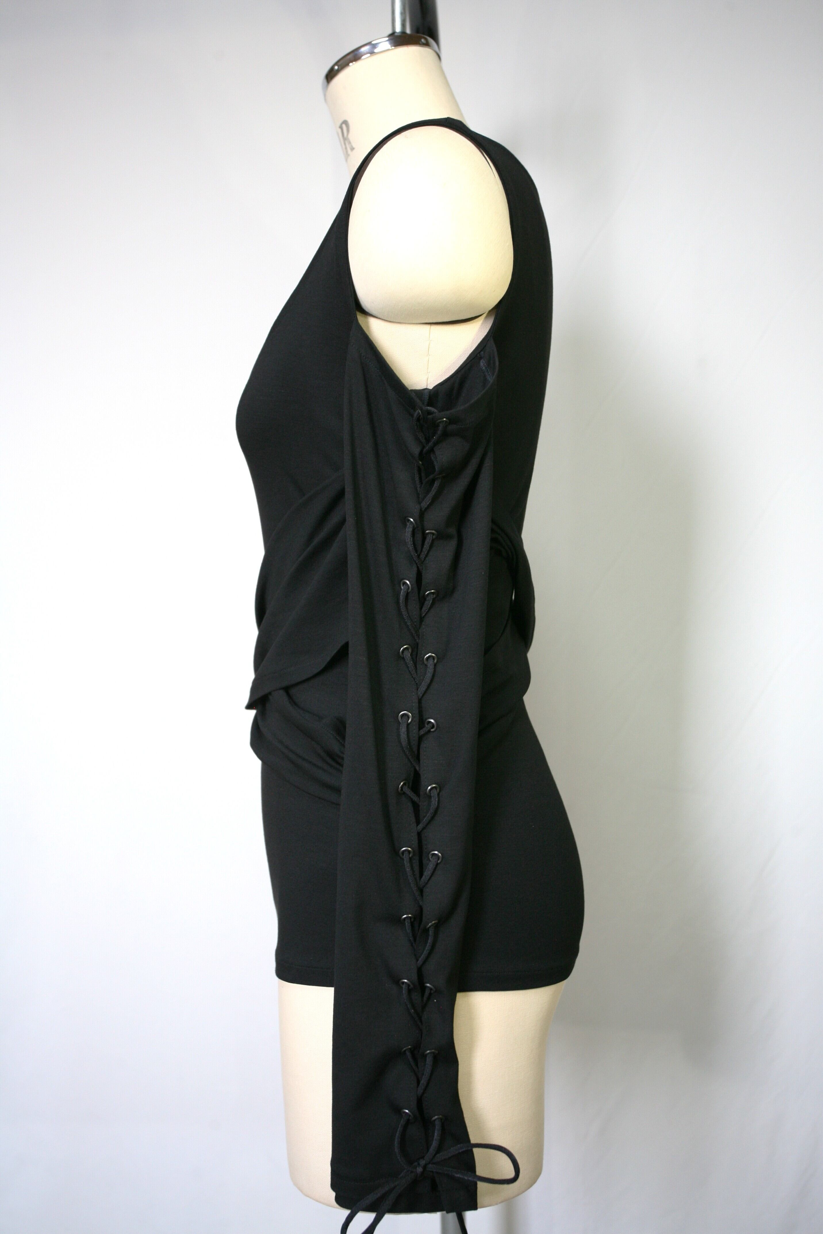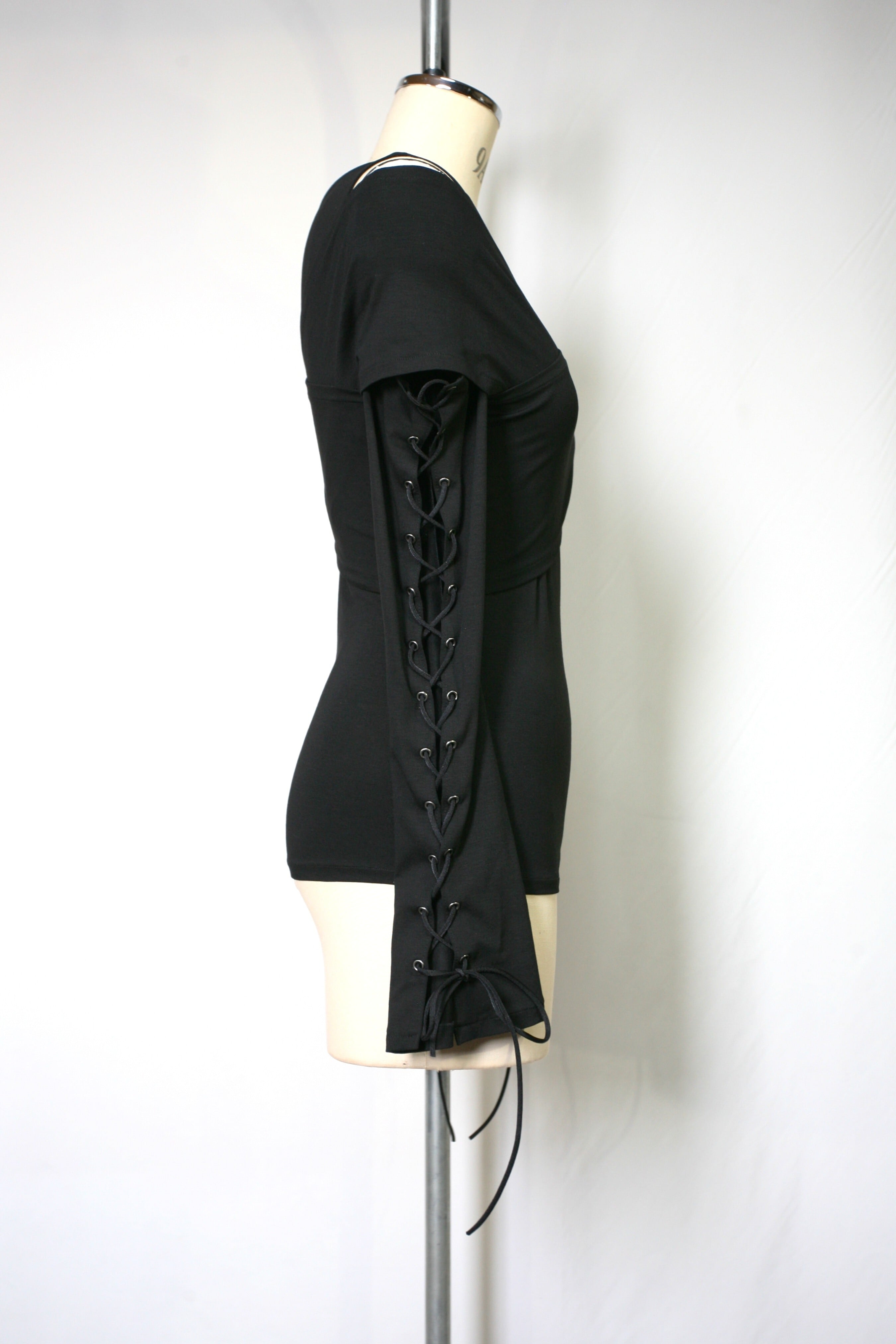 袖は肩先が大きく開いていて、袖山から袖口までスリット開きになっていてハトメで編み上げになっています。