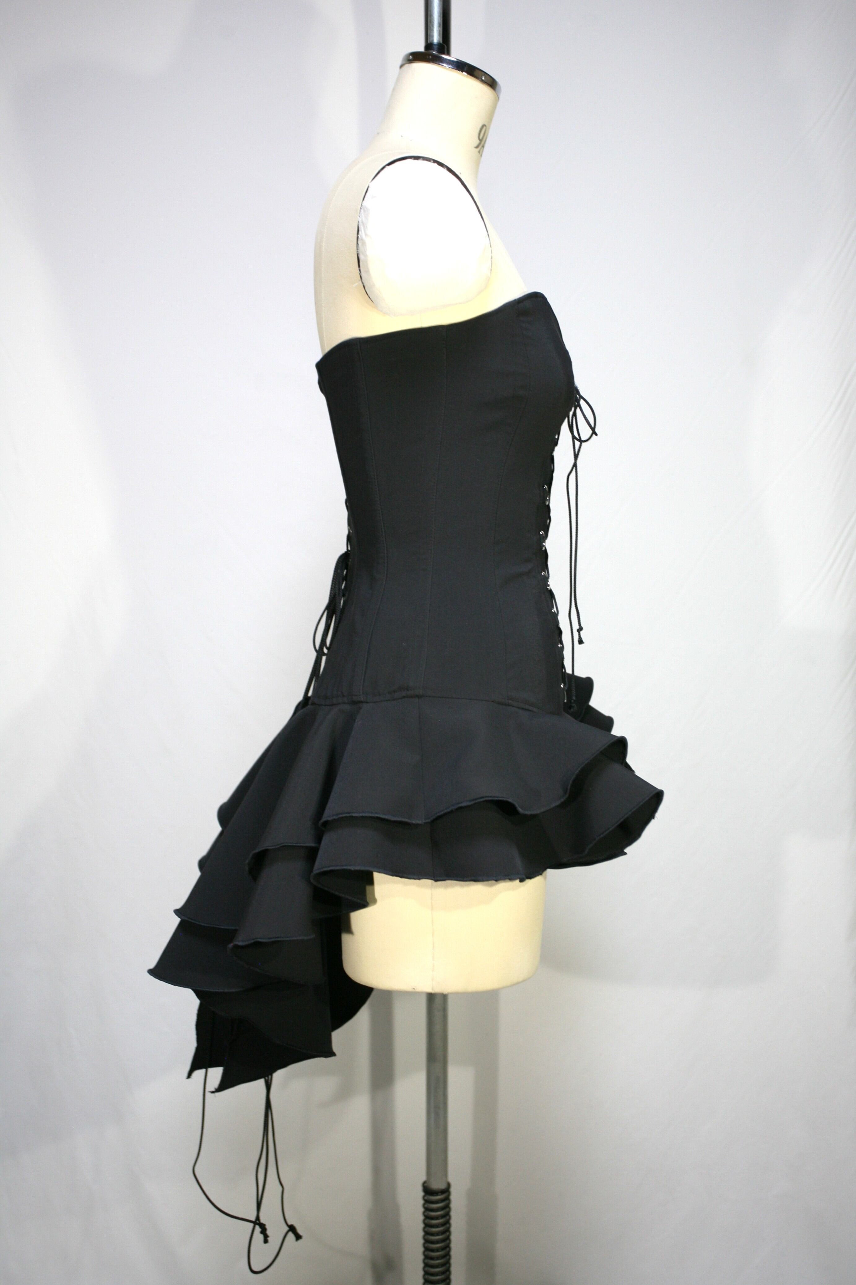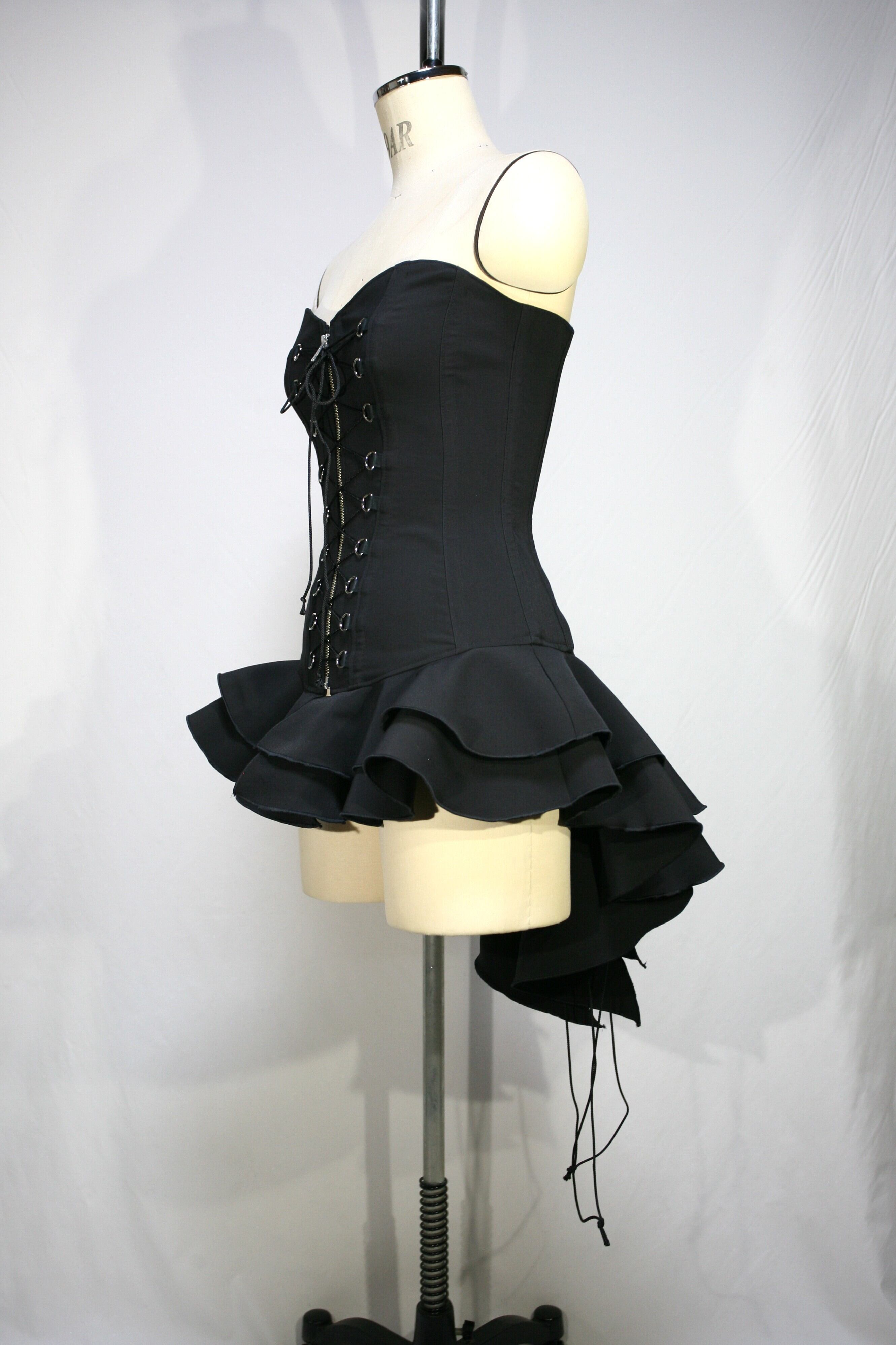 前身頃の切り替えに12㎜のDカンを挟んでいて、前中心オのープンファスナー上で編み上げになっています。