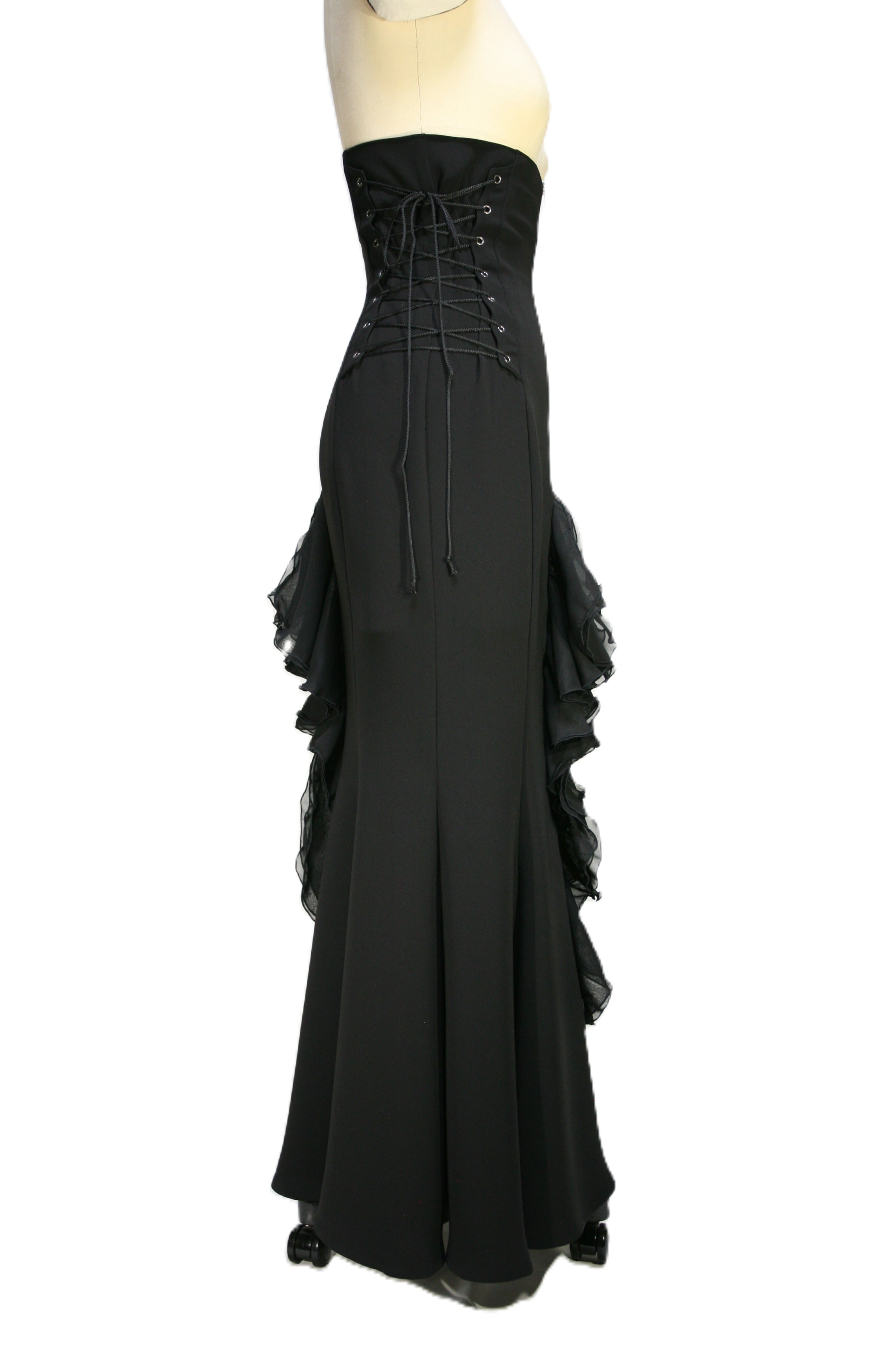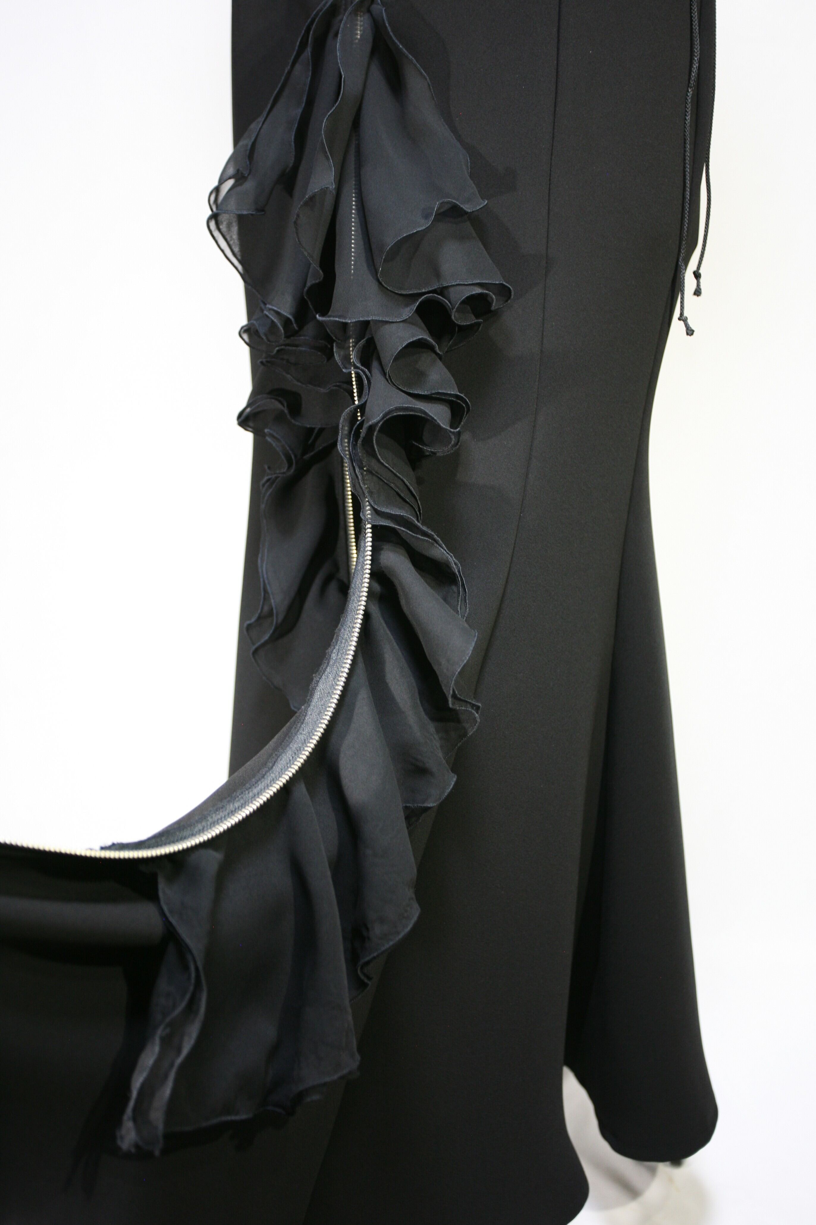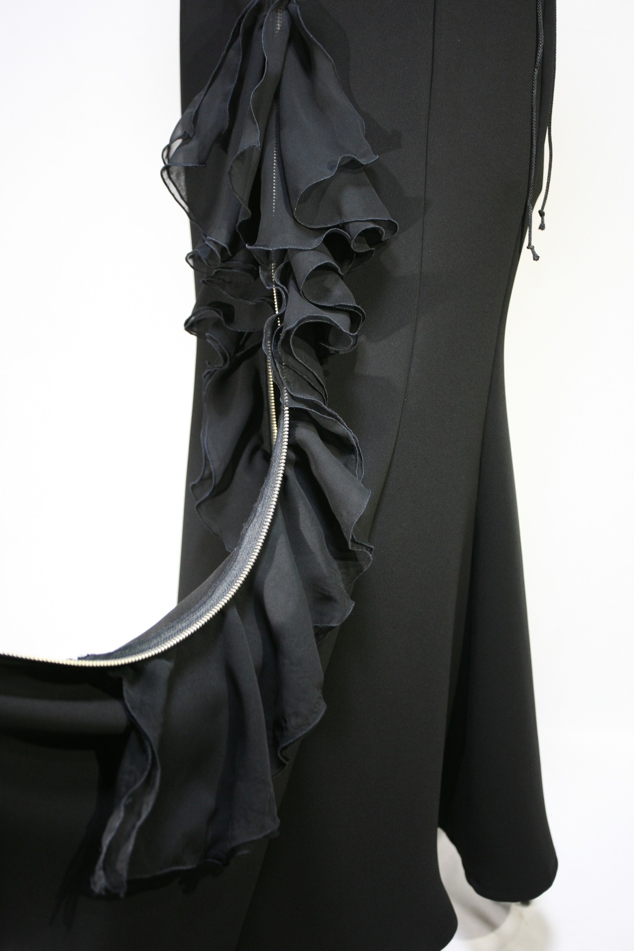 後中心と前中心のダブルジッパー脇に薄手ジョーゼットのフリルを2枚重ねて挟んでいます。