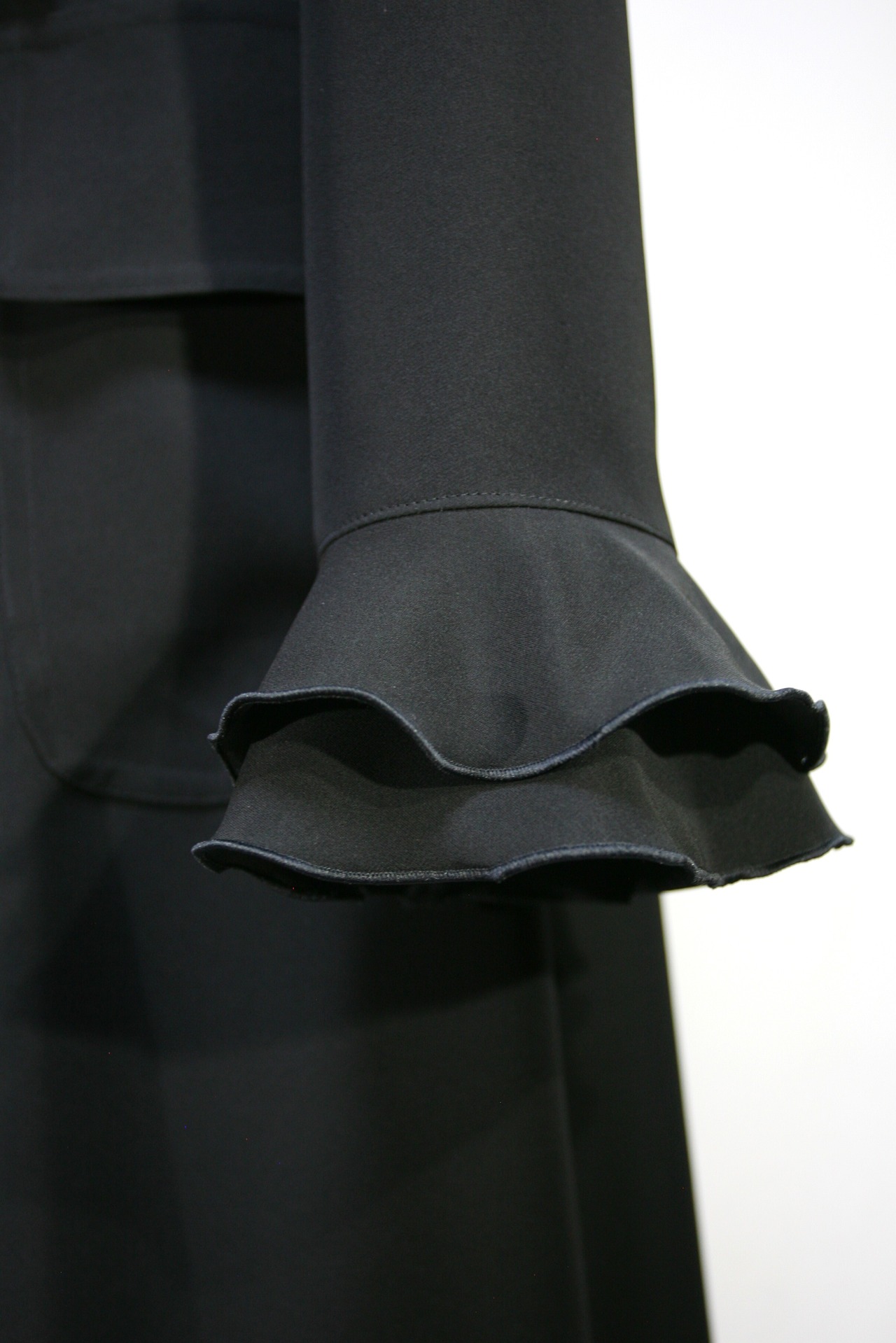 前上身頃のフリルと袖口の2段フリルは巻きロック始末になっています。