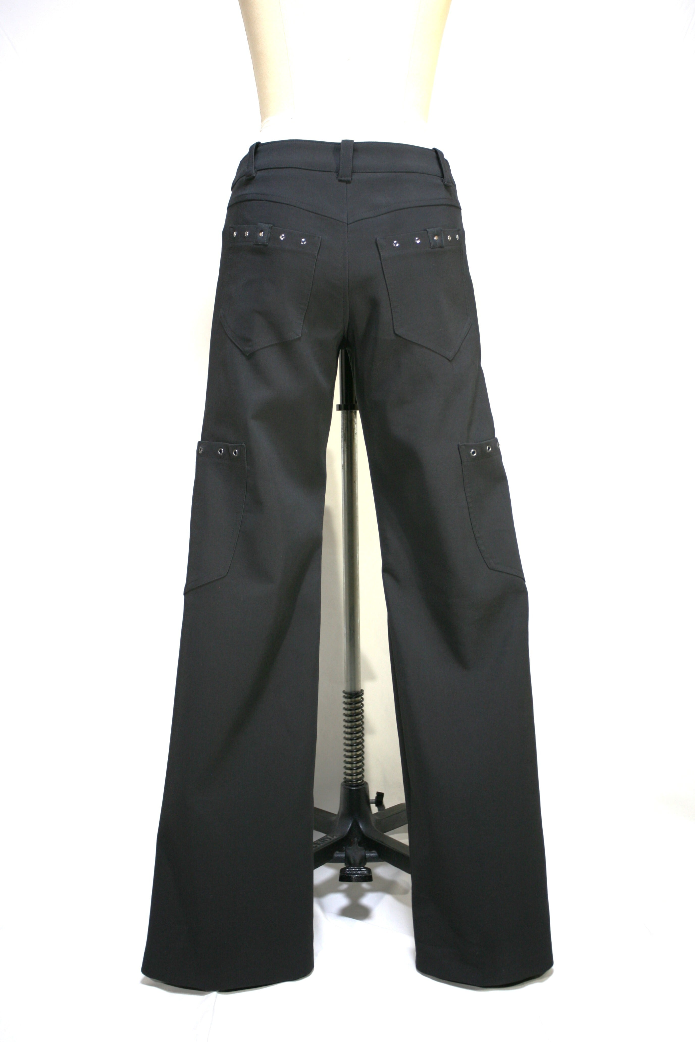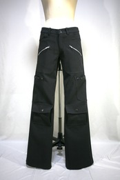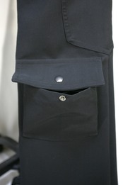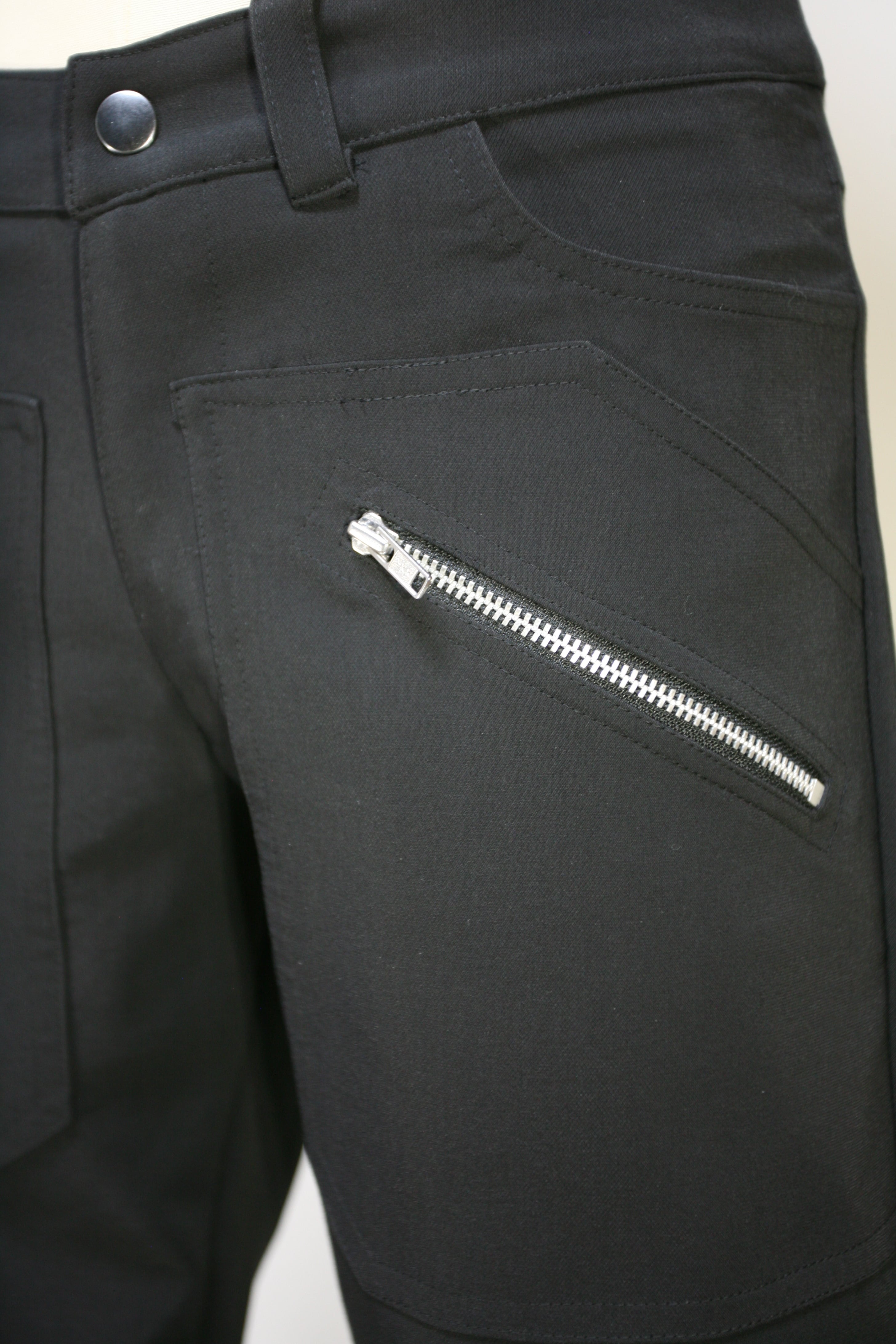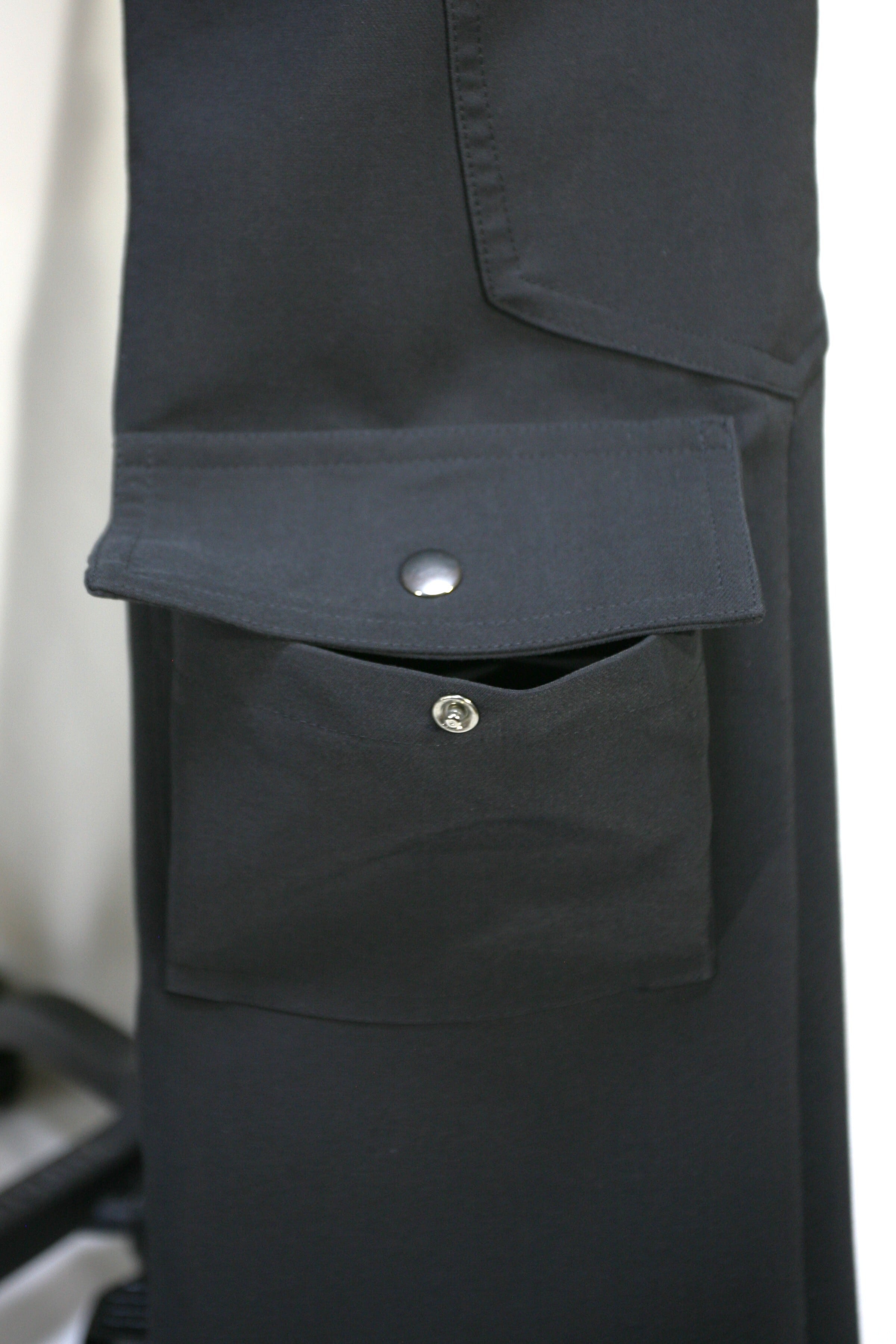 前パンツのポケットは、上からファスナー開きパッチポケット・ポケット口にハトメを開けたパッチポケット・ドット釦留めフラップ付のパッチポケット・後ろパンツにはポケット口にカシメを打ったパッチポケットが付いています。