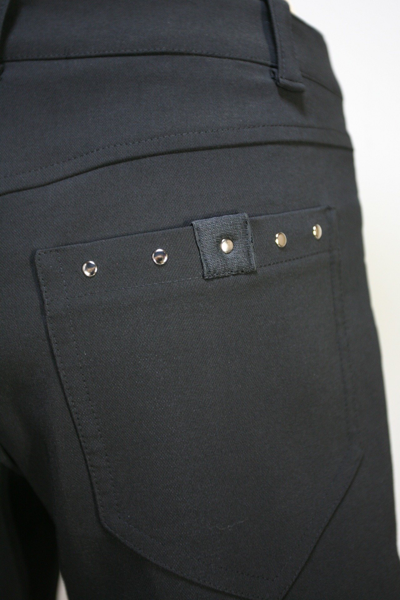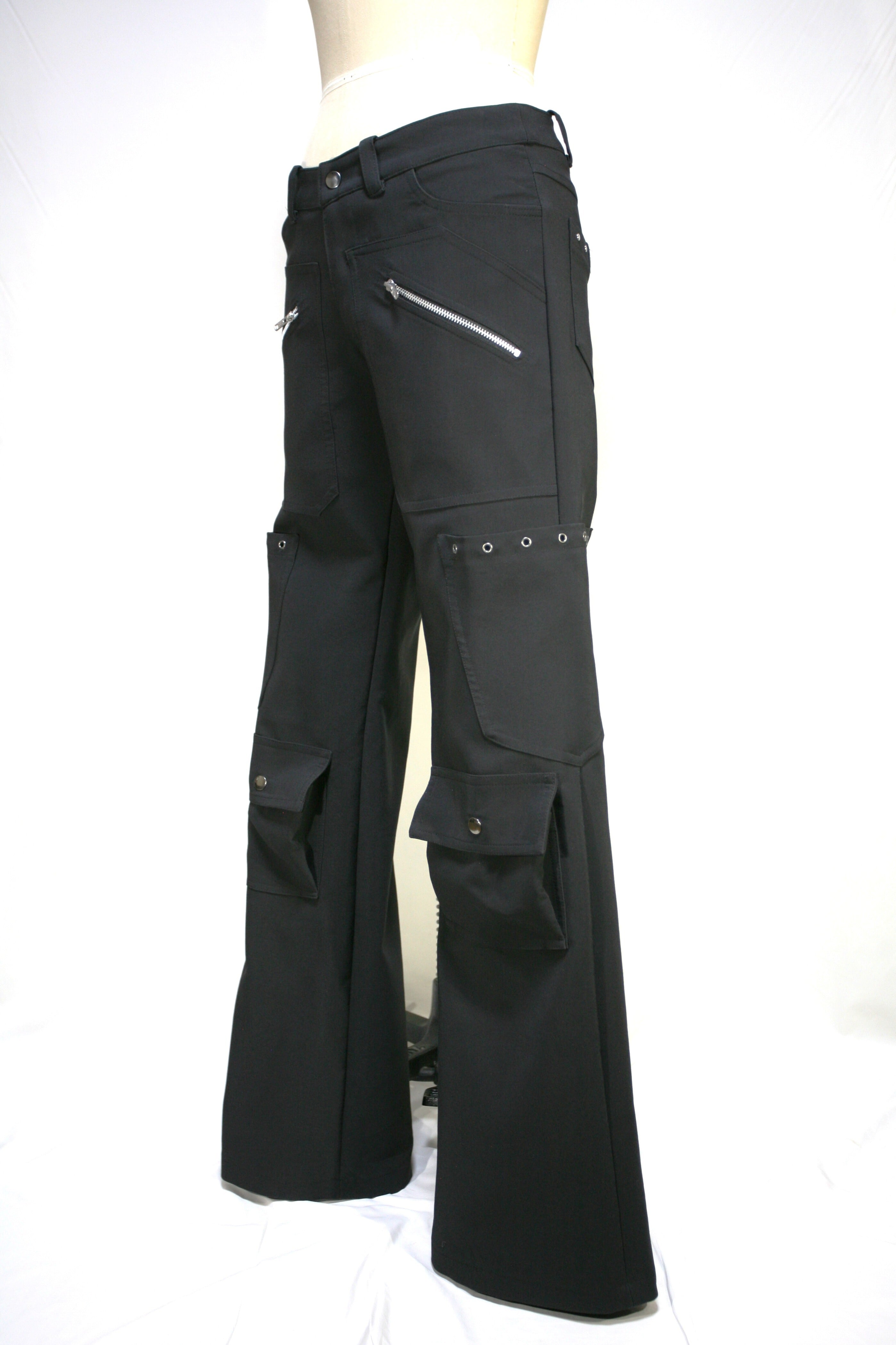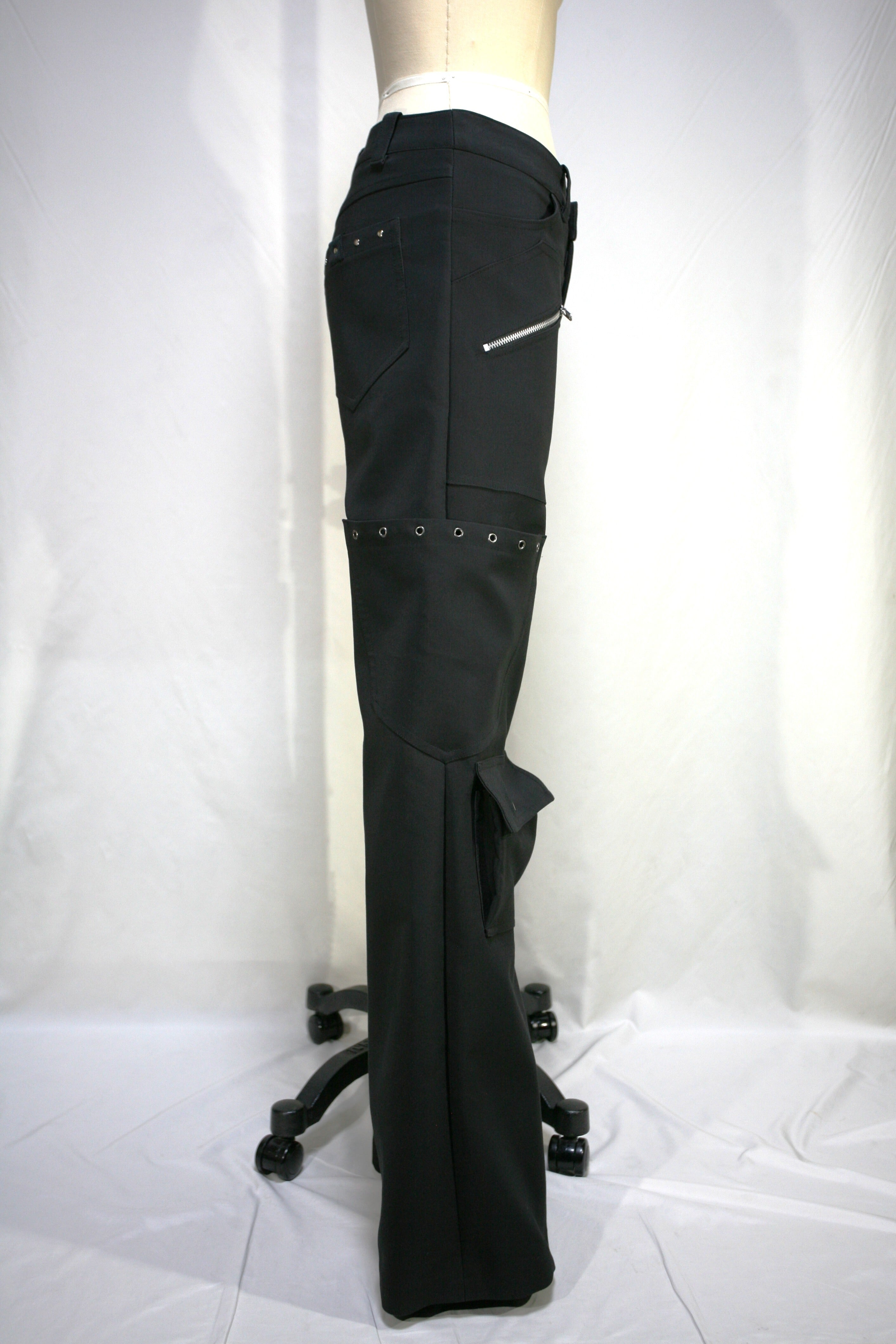 前パンツのポケットは、上からファスナー開きパッチポケット・ポケット口にハトメを開けたパッチポケット・ドット釦留めフラップ付のパッチポケット・後ろパンツにはポケット口にカシメを打ったパッチポケットが付いています。