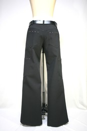 前パンツのポケットは、上からファスナー開きパッチポケット・ポケット口にハトメを開けたパッチポケット・ドット釦留めフラップ付のパッチポケット・後ろパンツにはポケット口にカシメを打ったパッチポケットが付いています。