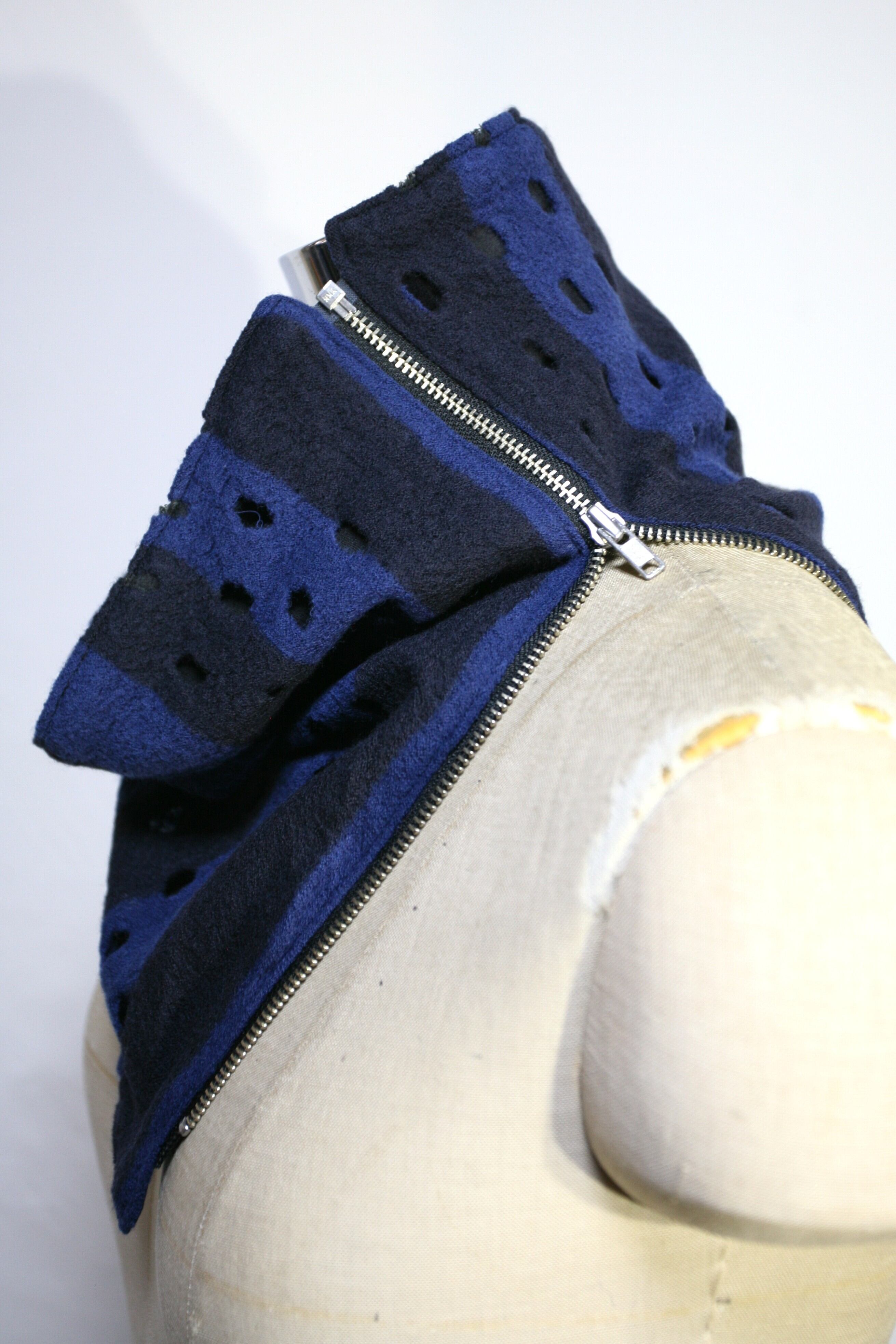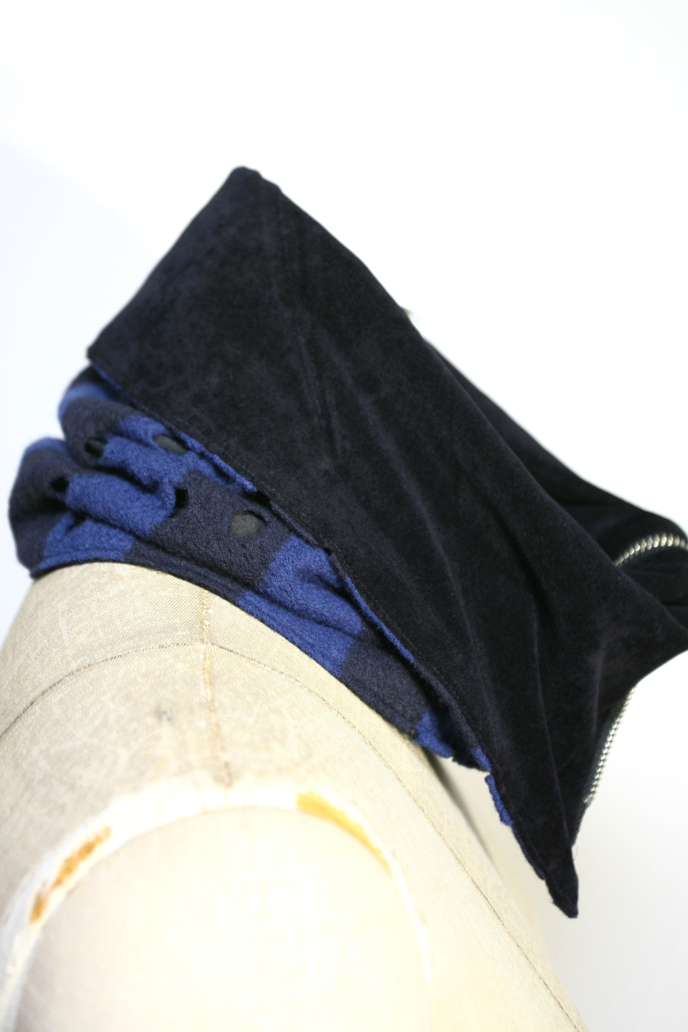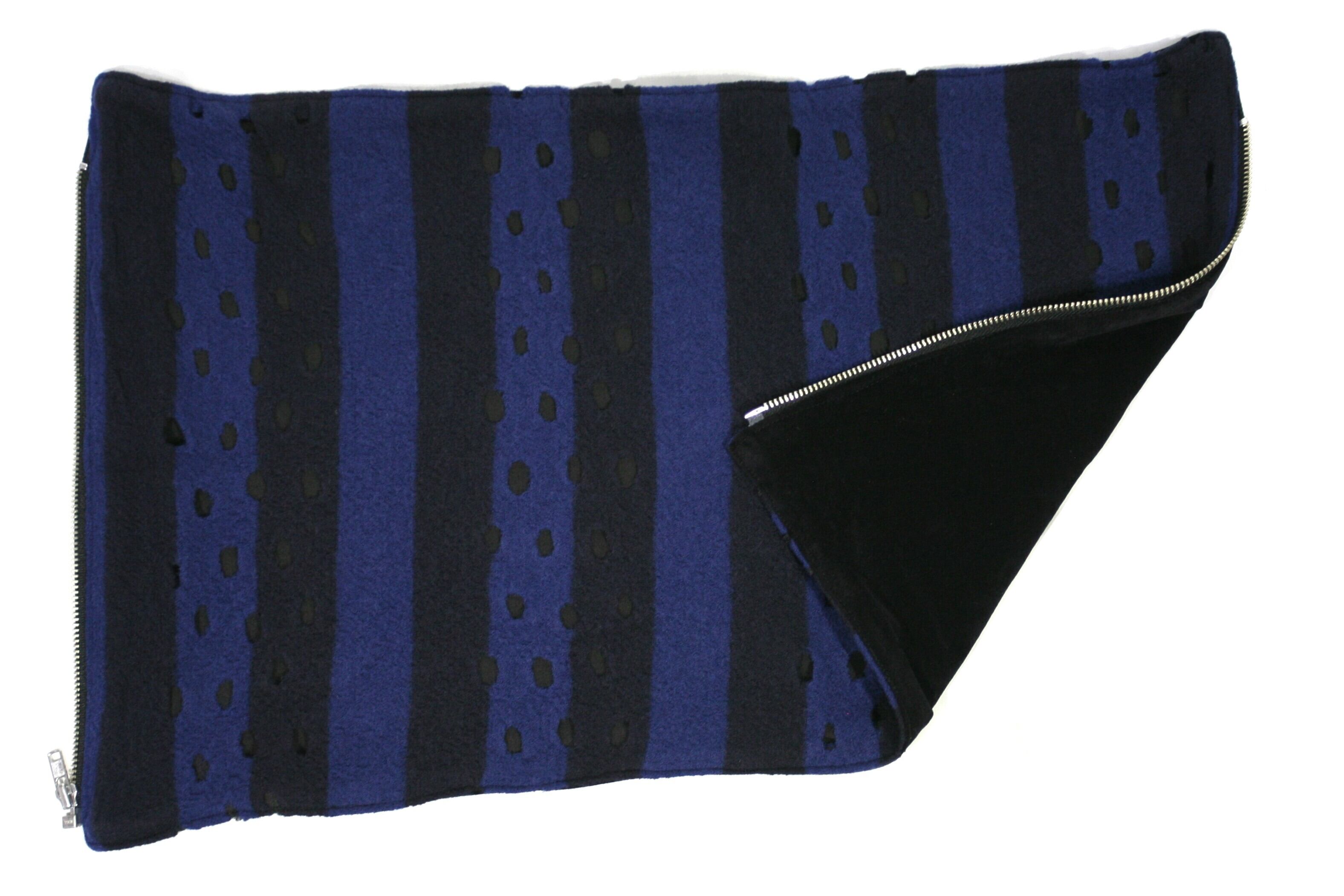 表側は部分的に穴の開いた黒×青のストライプ、裏側は黒無地のベロアになっています。