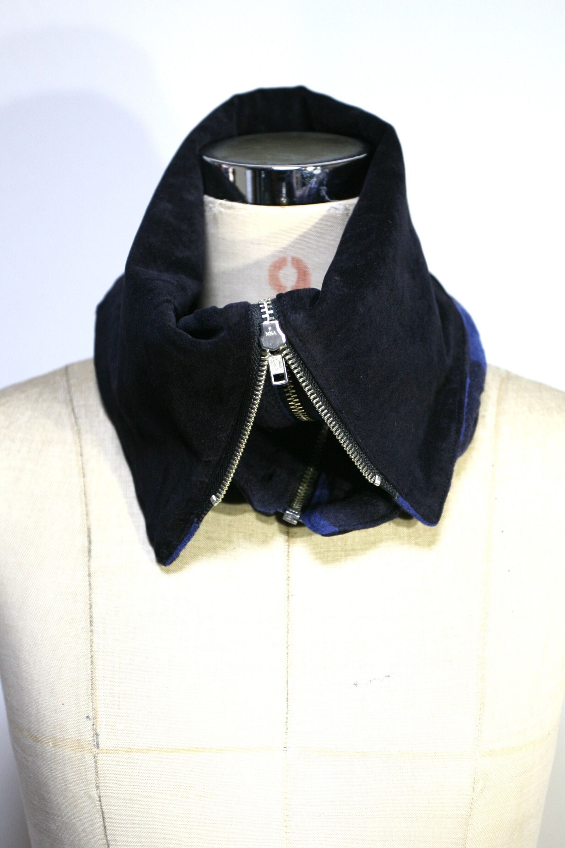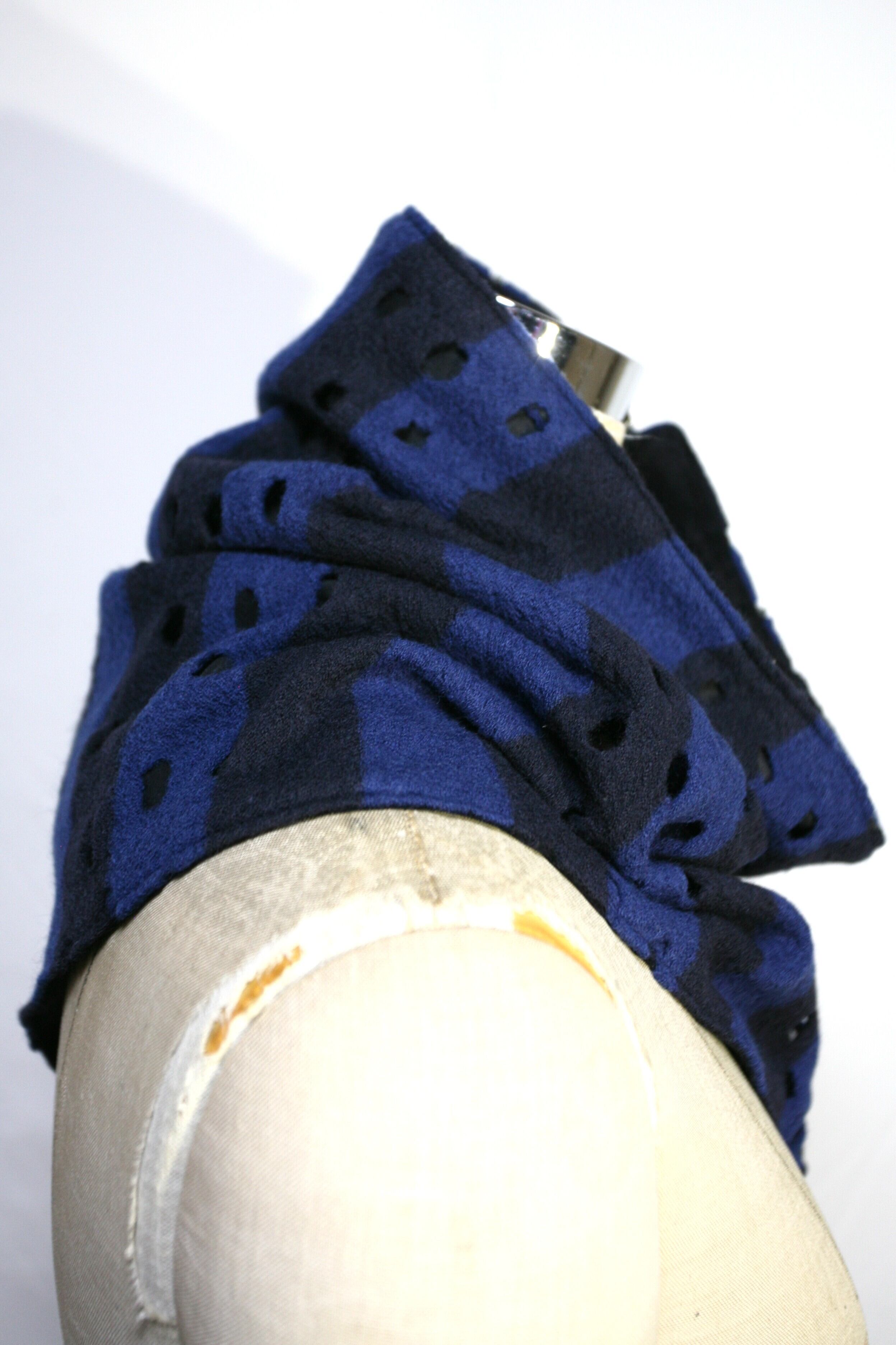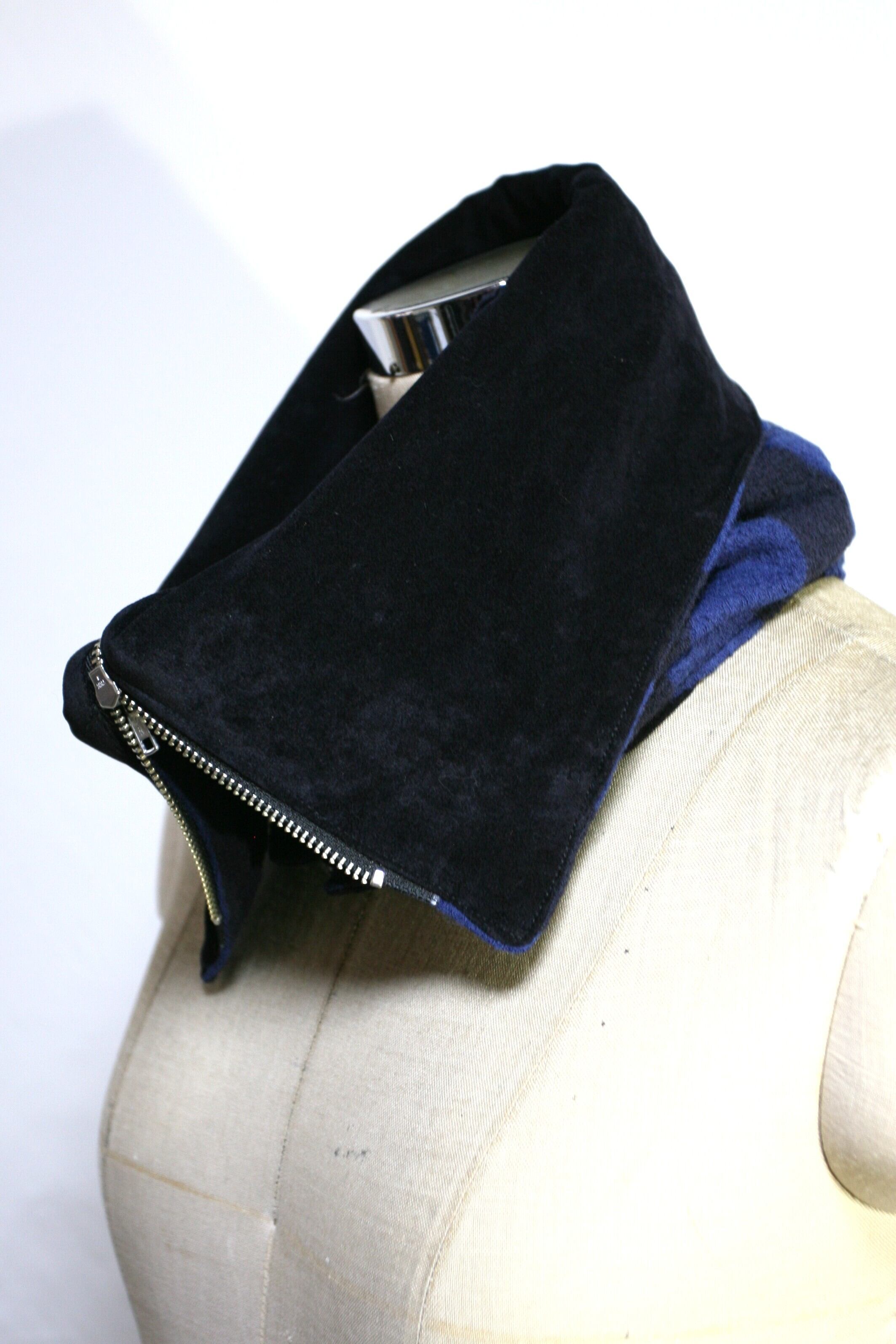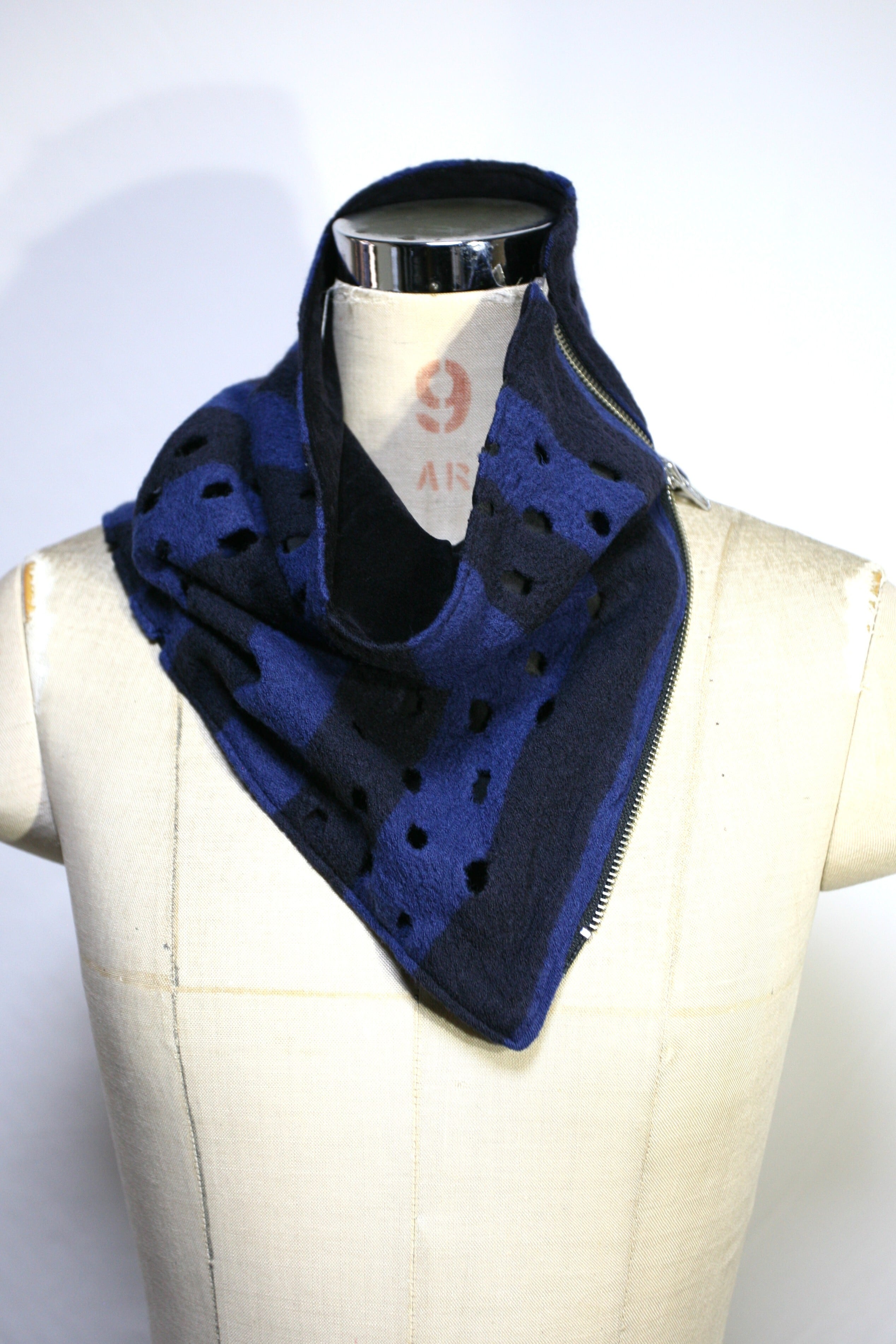 表側は部分的に穴の開いた黒×青のストライプ、裏側は黒無地のベロアになっています。