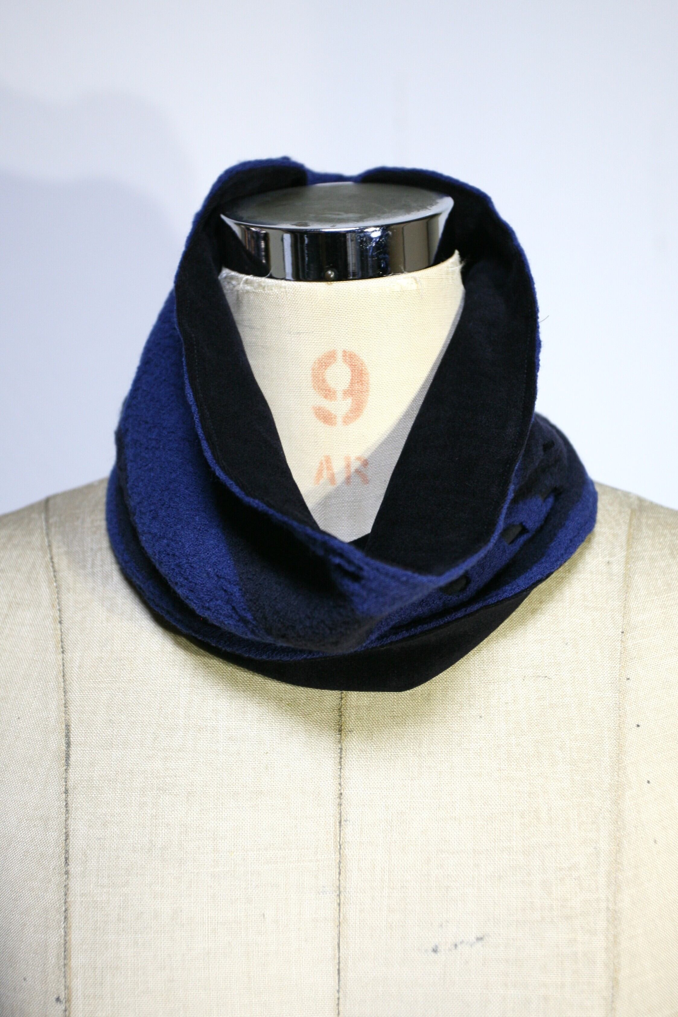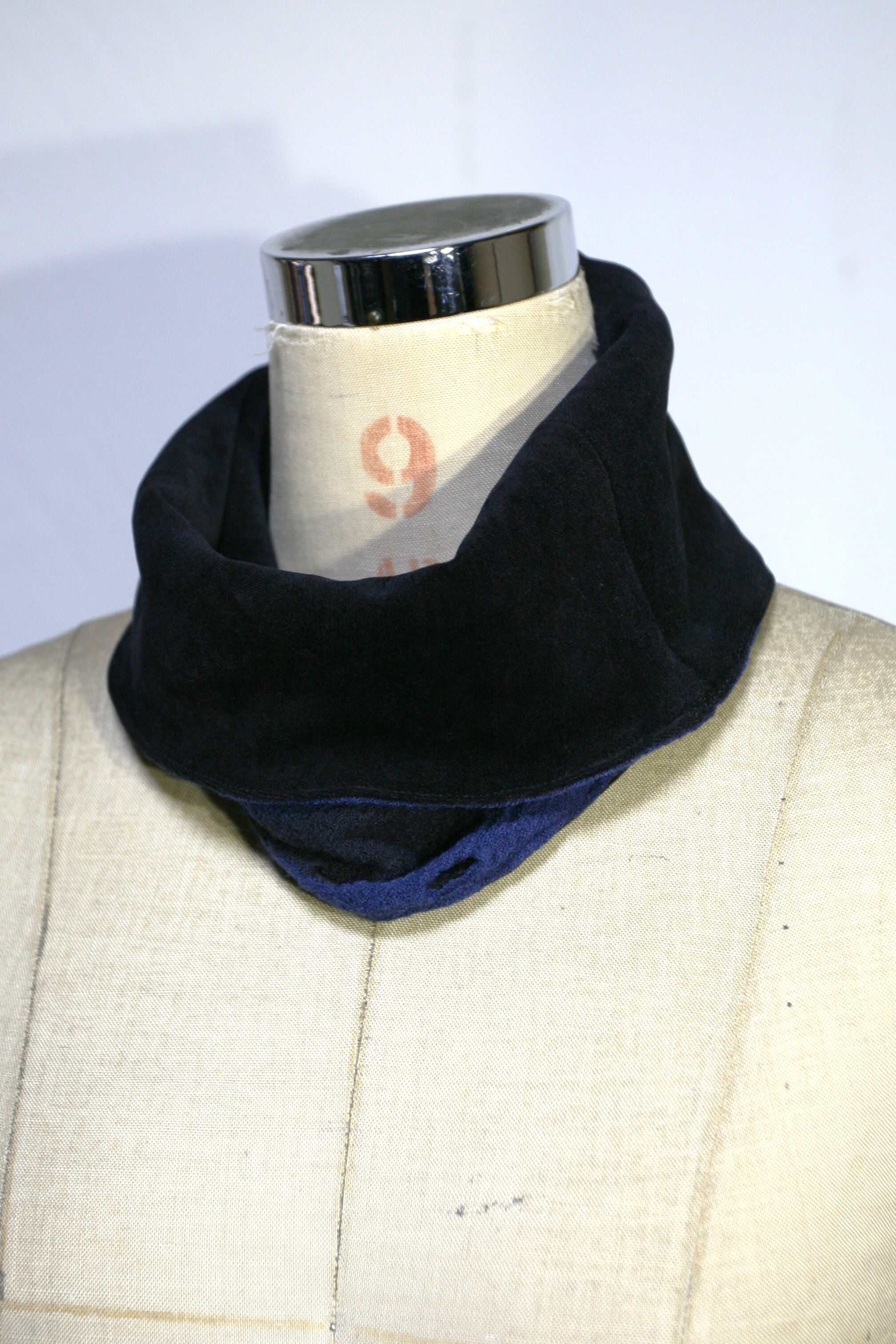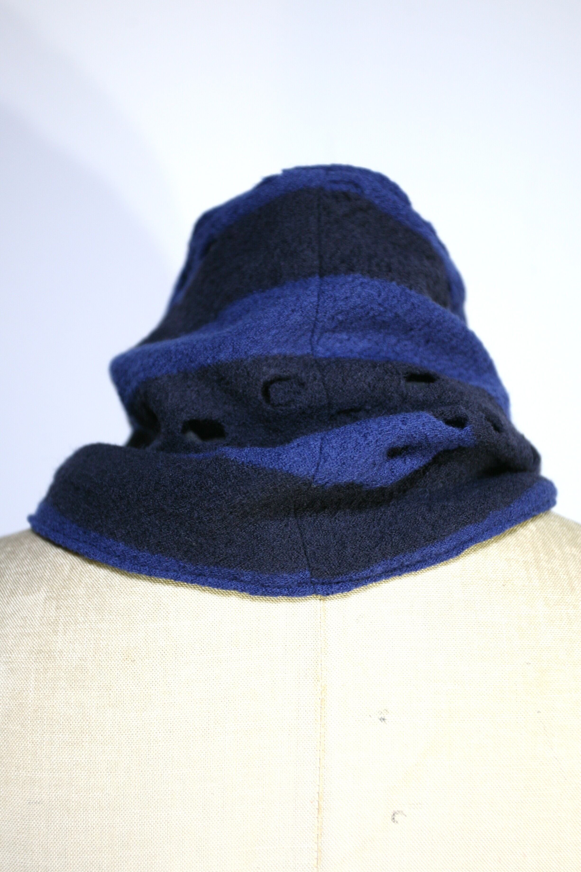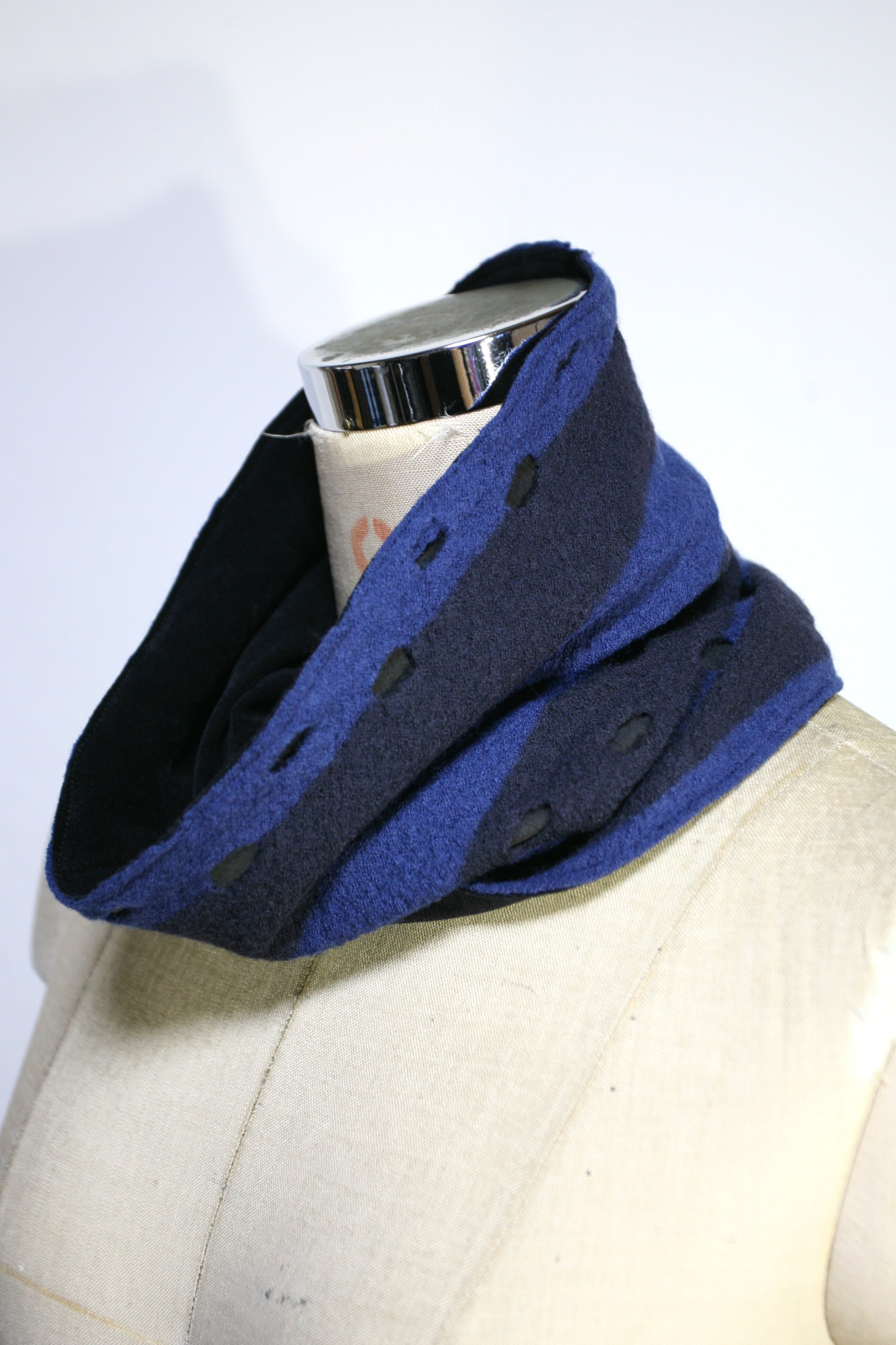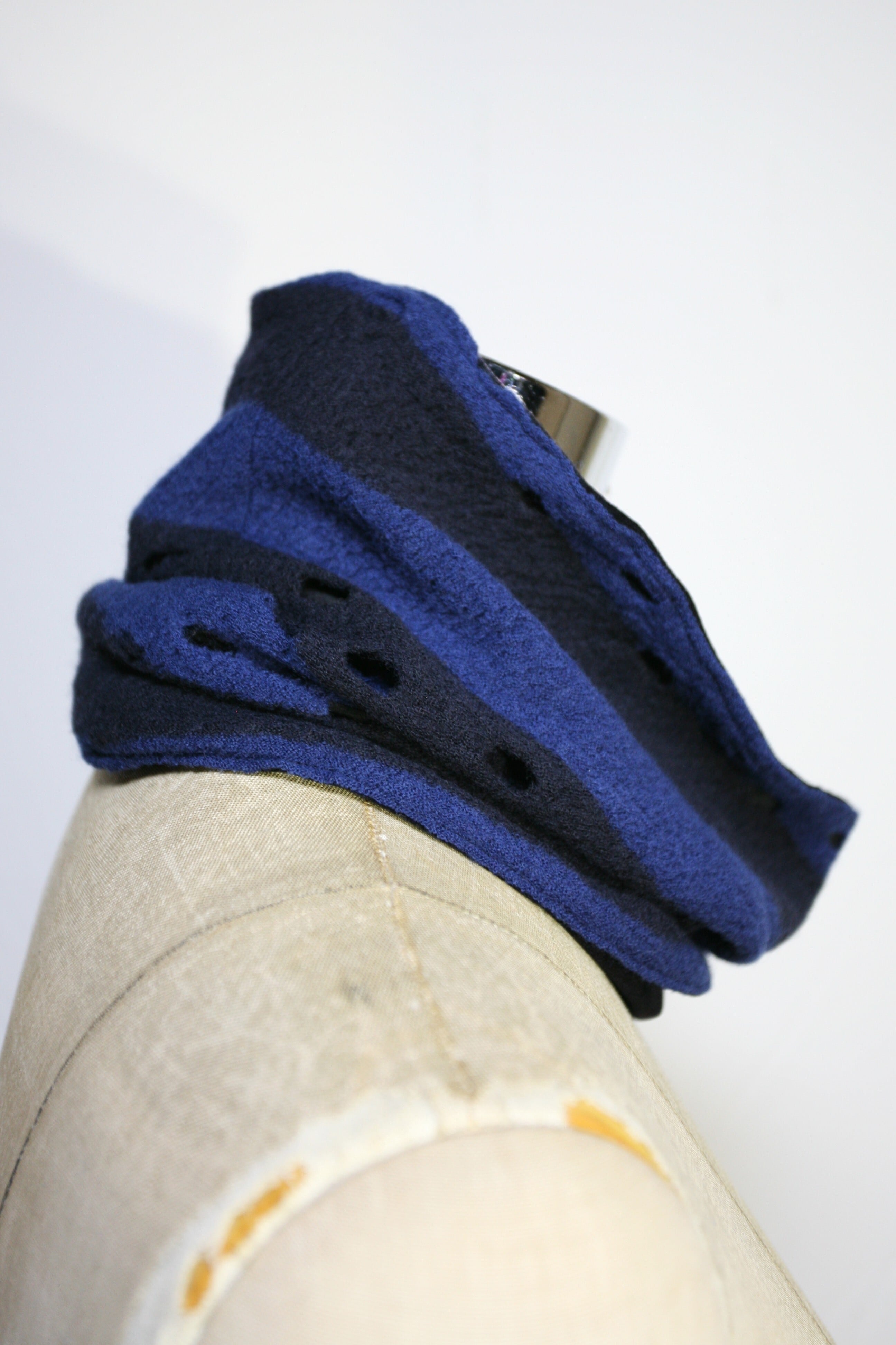 表側は部分的に穴の開いた黒×青のストライプ、裏側は黒無地のベロアになっています。