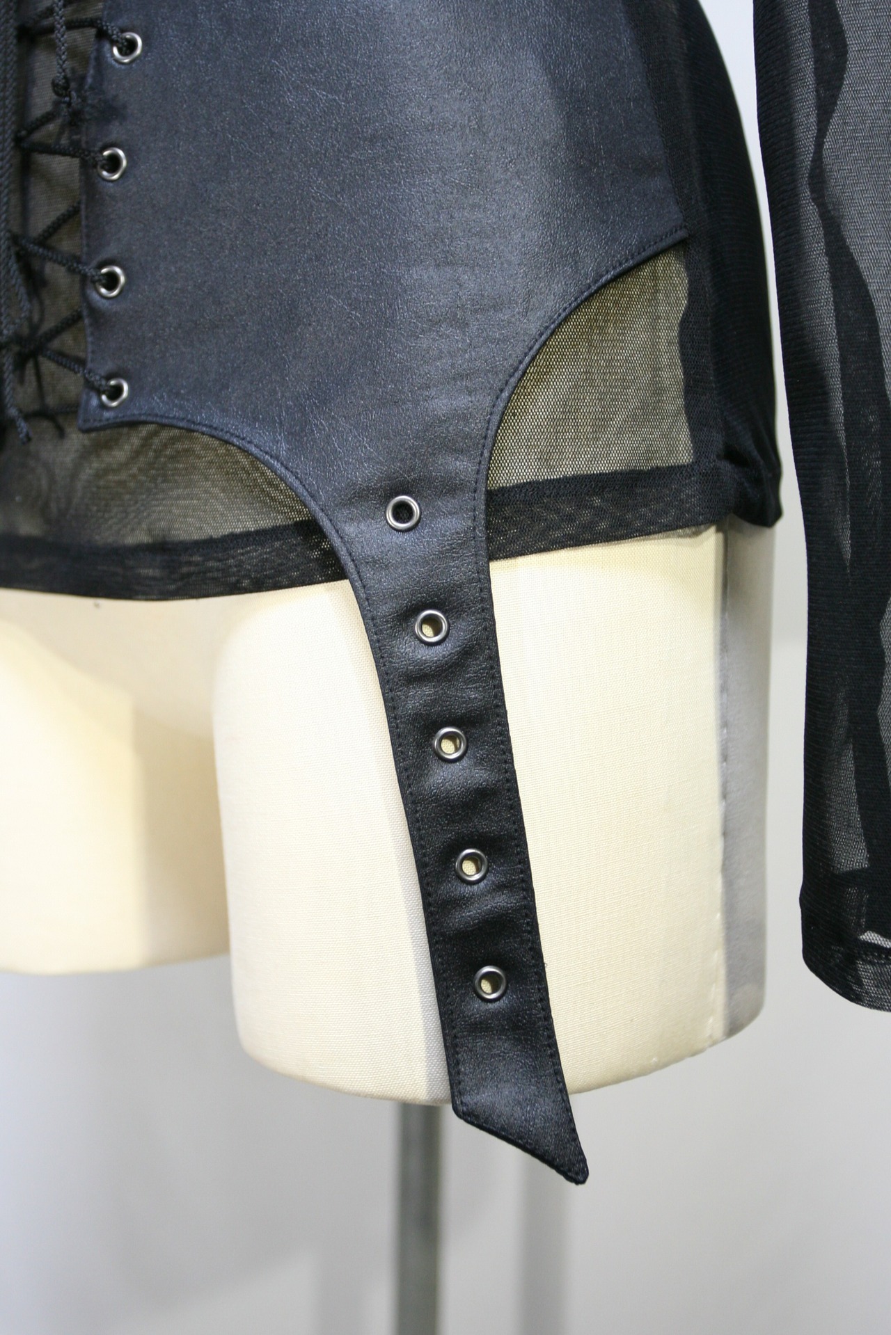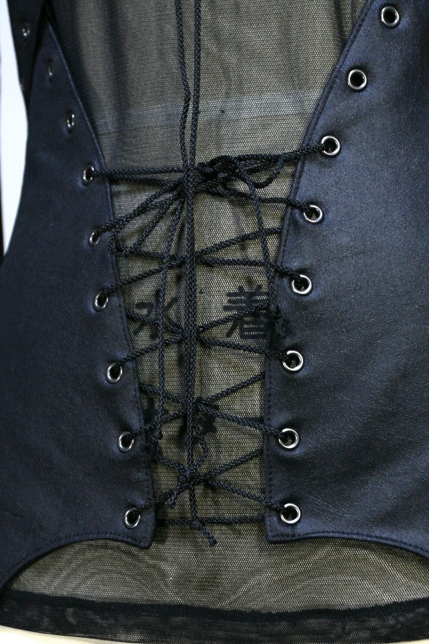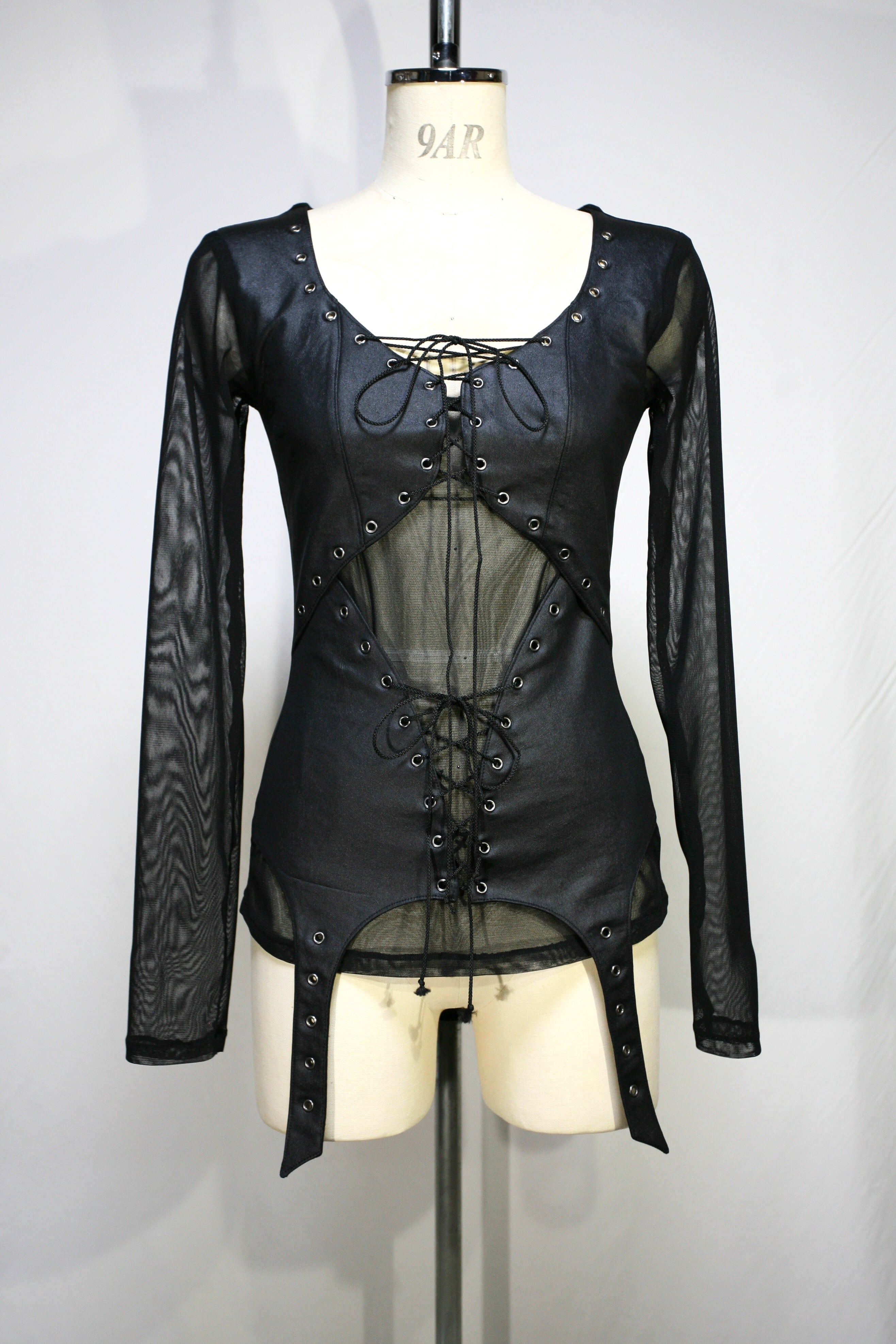 前身頃のバストとウエスト部分にハトメで編み上げになったウレタンコーティングの生地を重ねています。