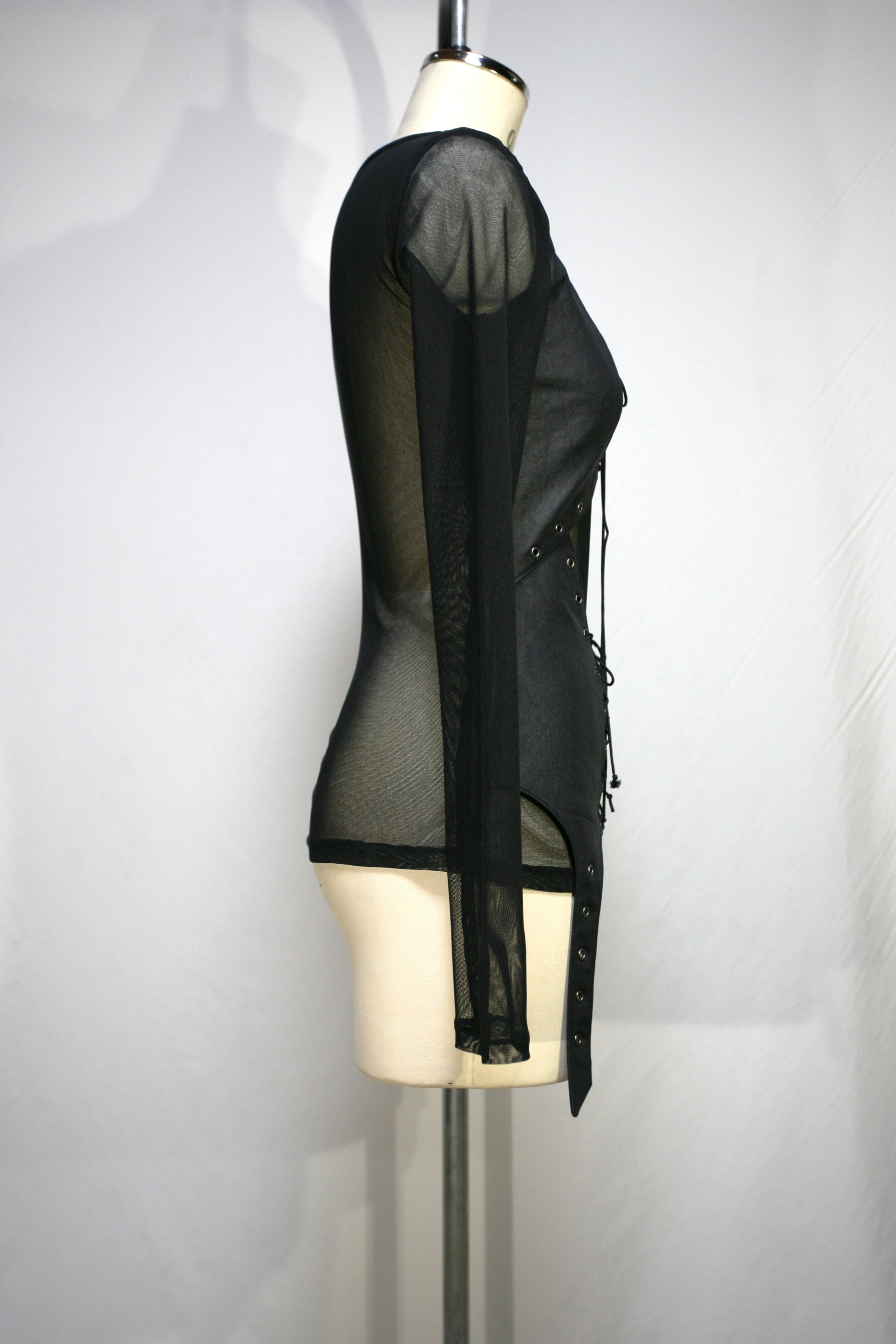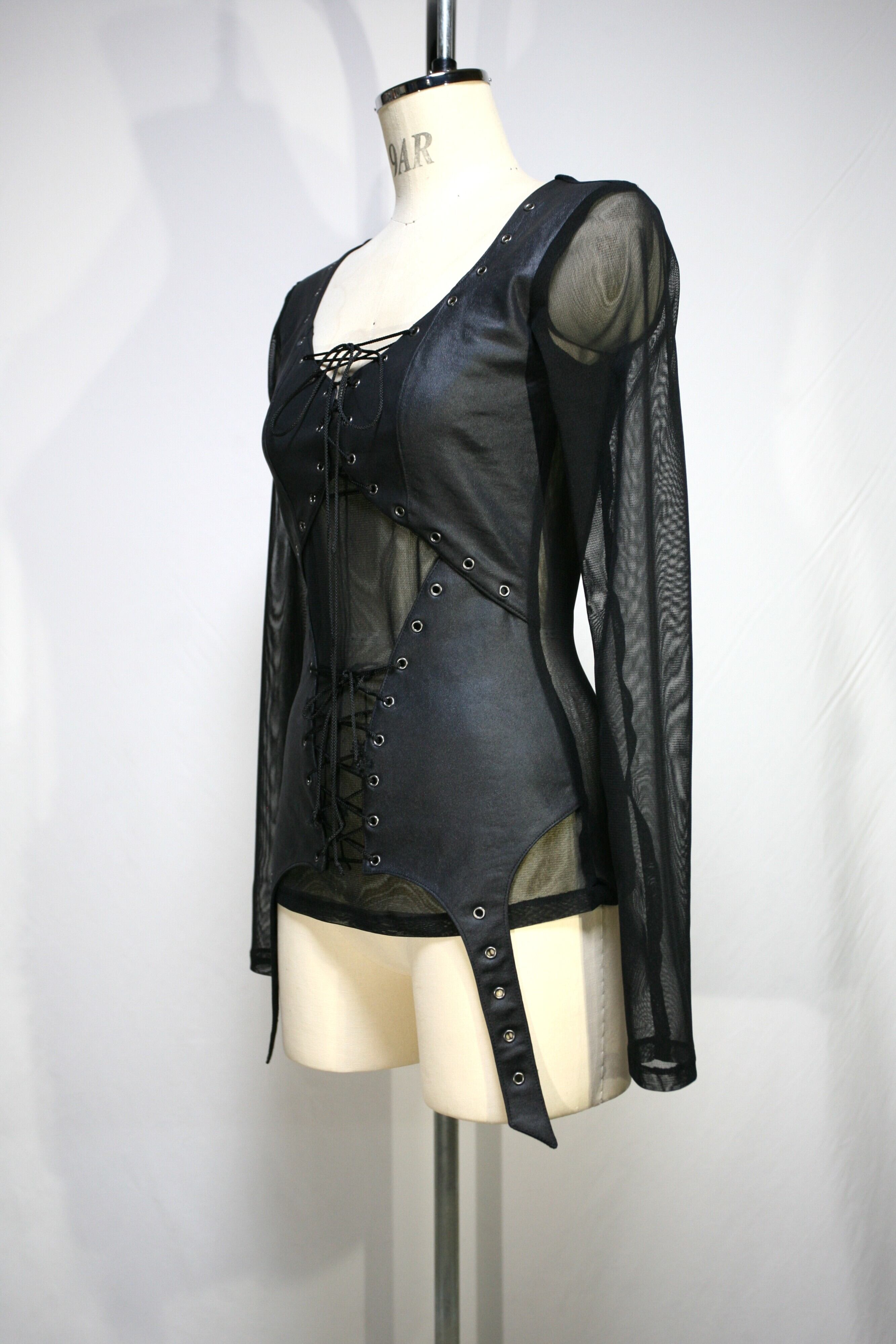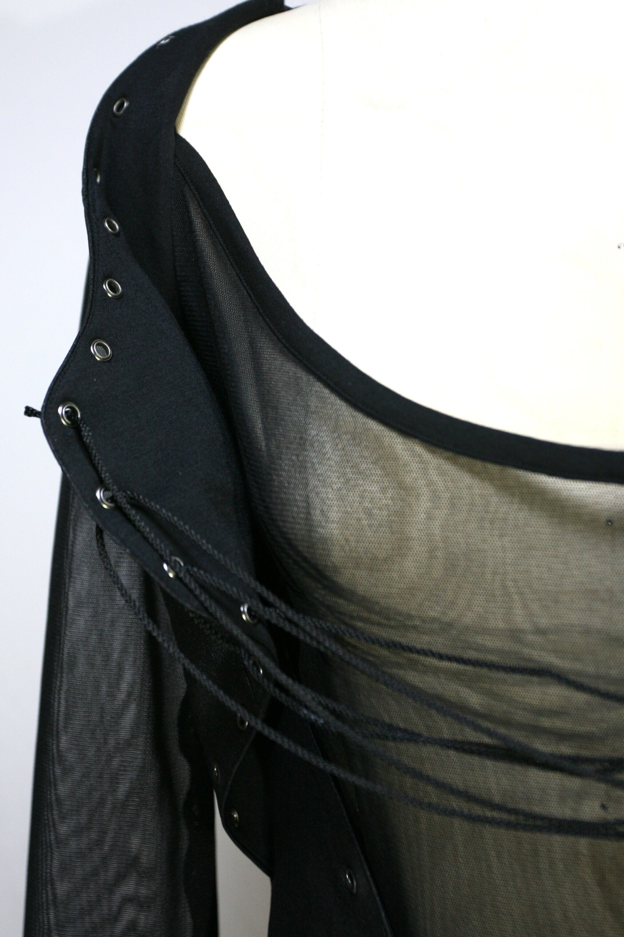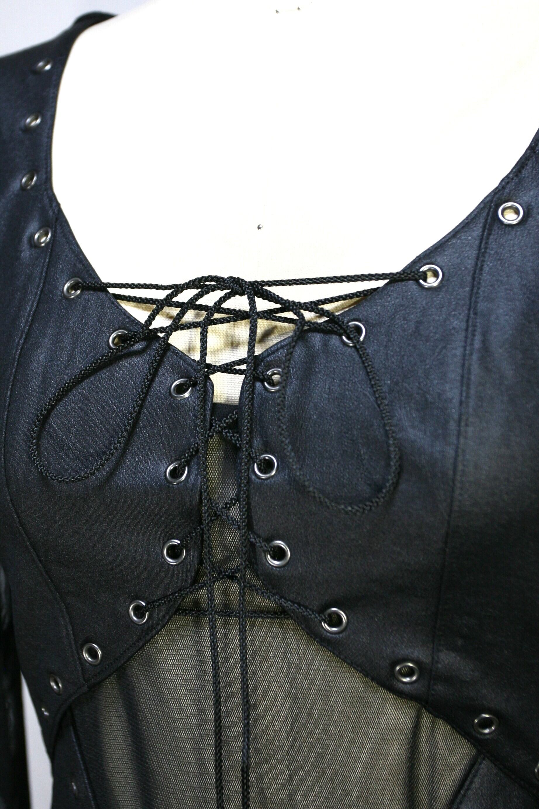 前身頃のバストとウエスト部分にハトメで編み上げになったウレタンコーティングの生地を重ねています。