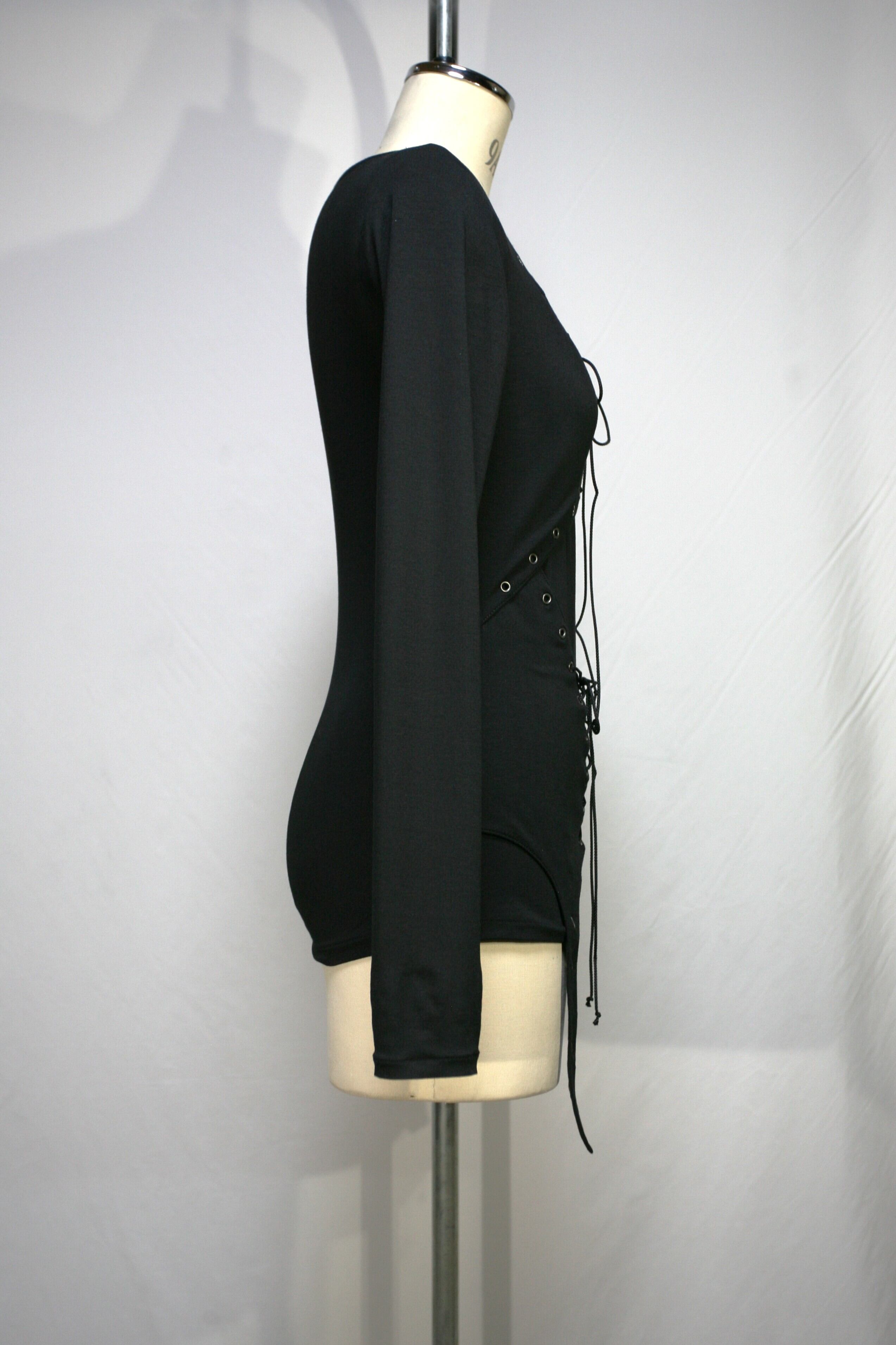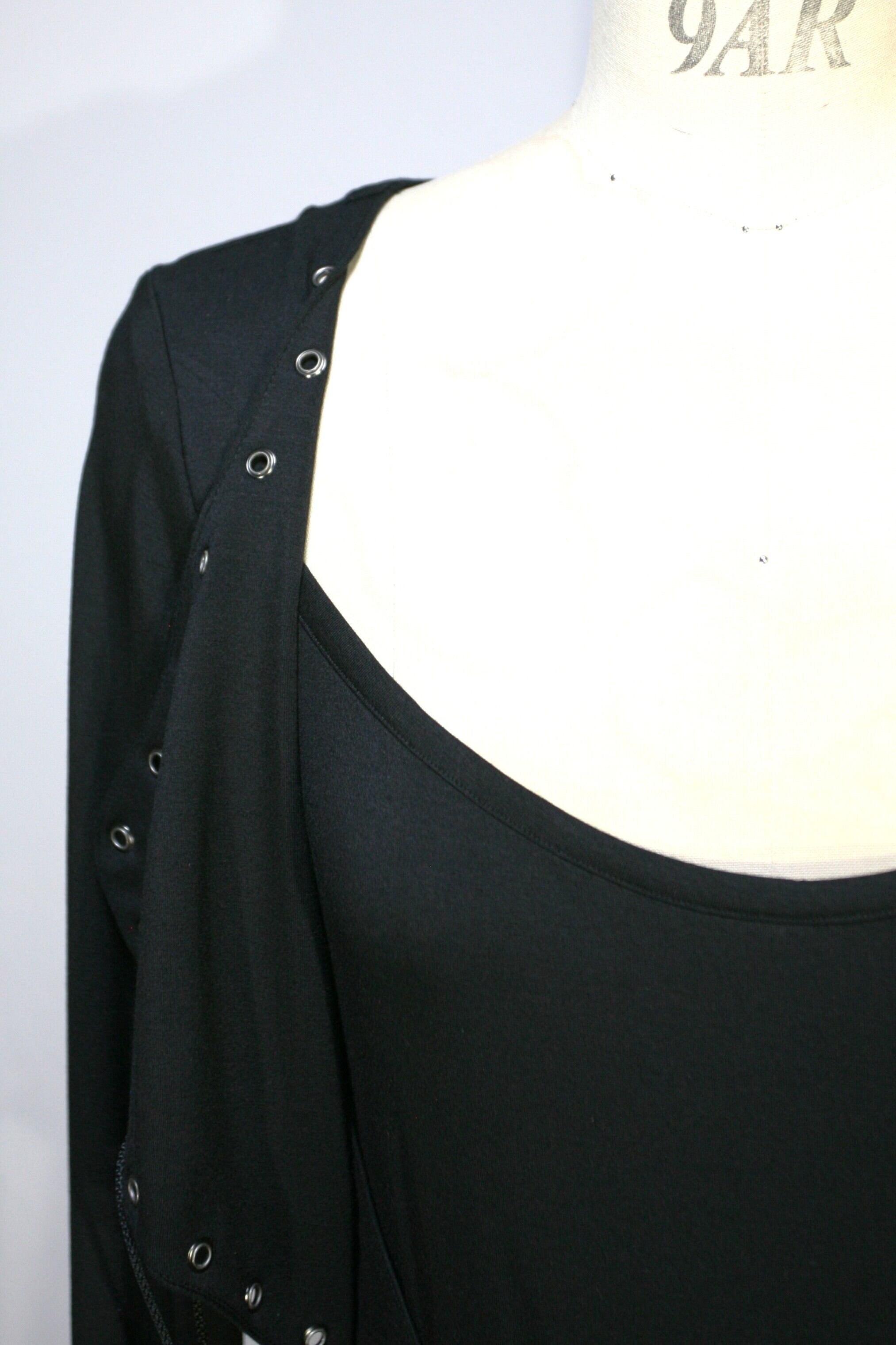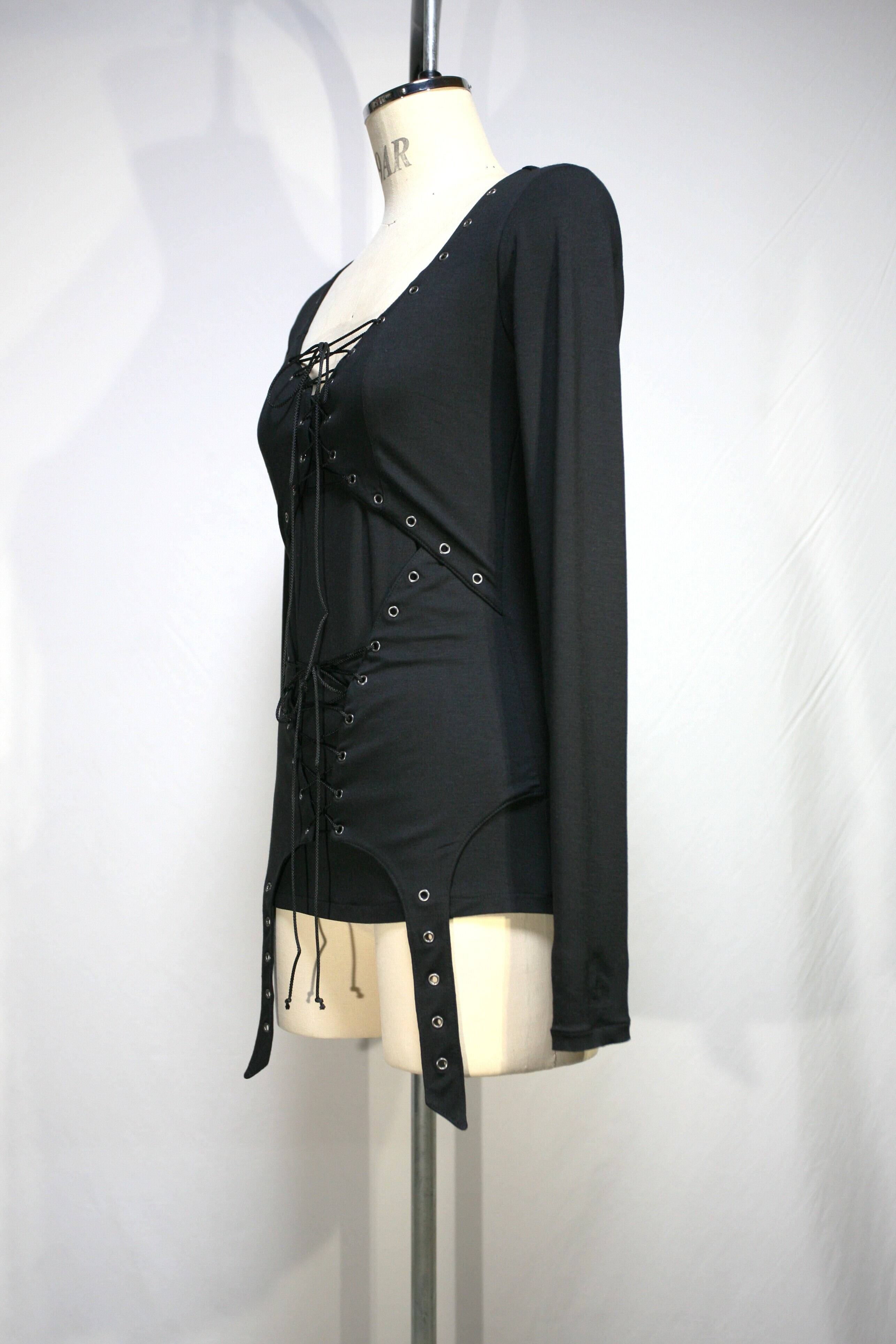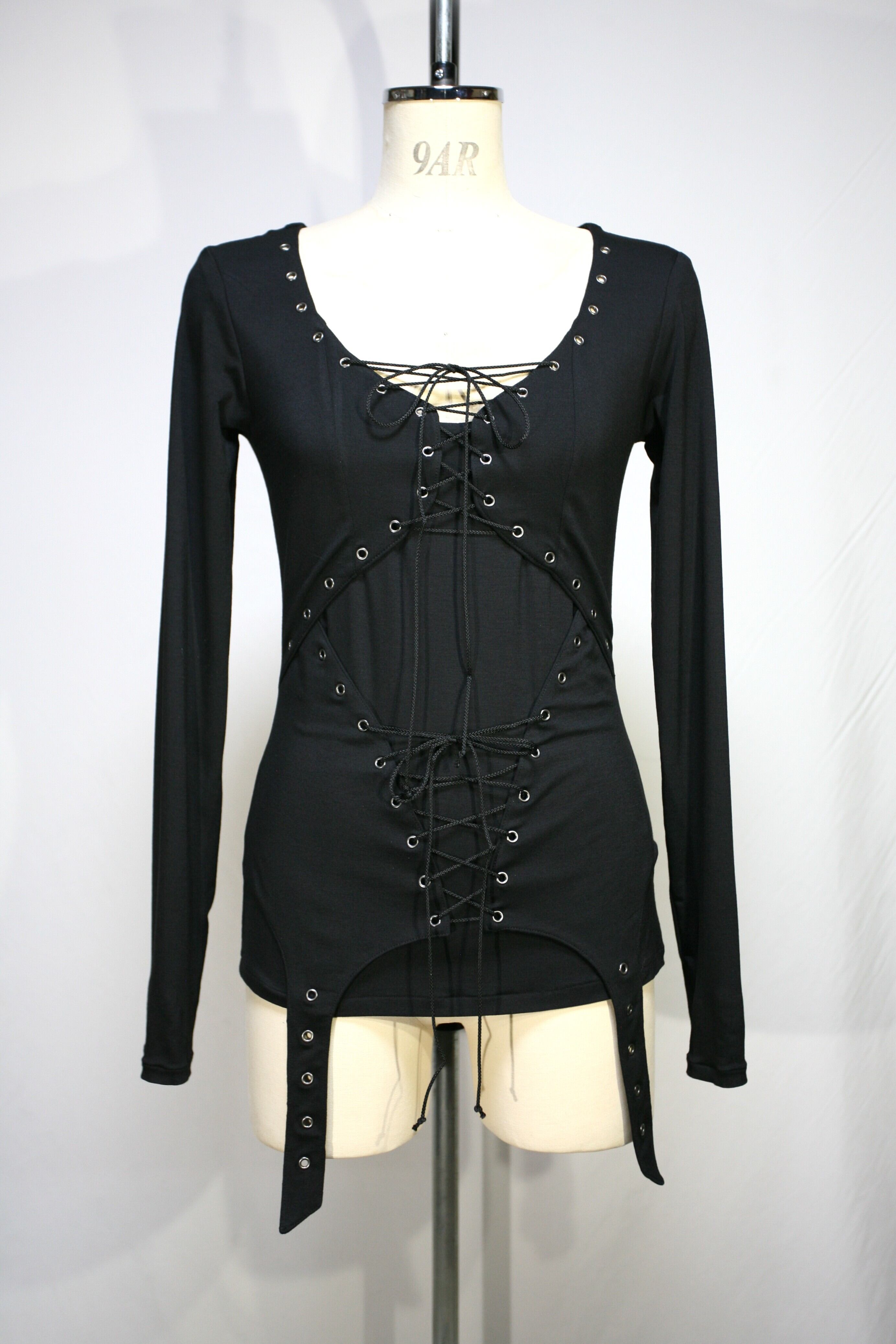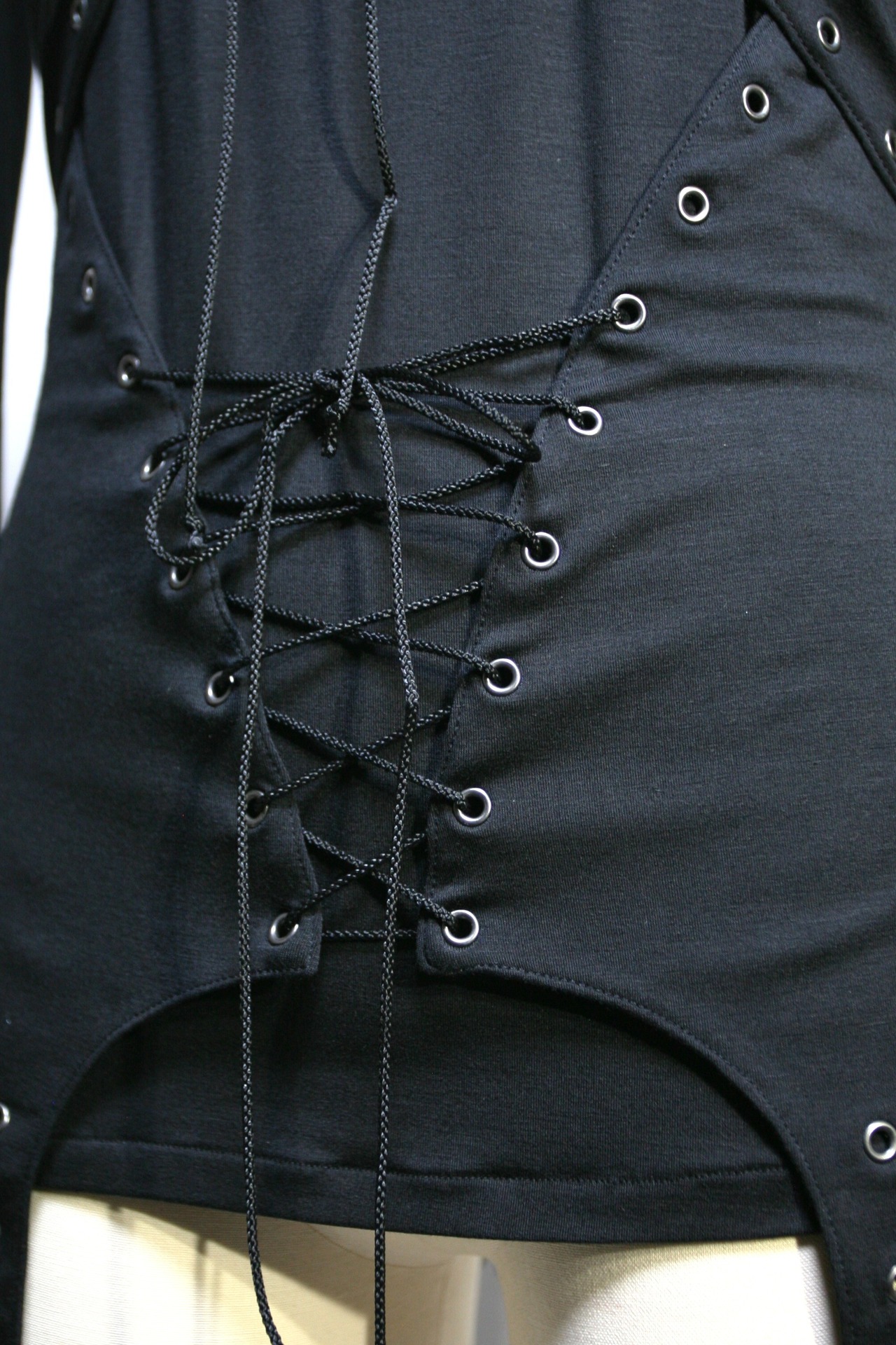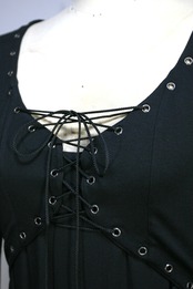 前身頃のバストとウエスト部分にハトメで編み上げになった表生地を重ねています。
