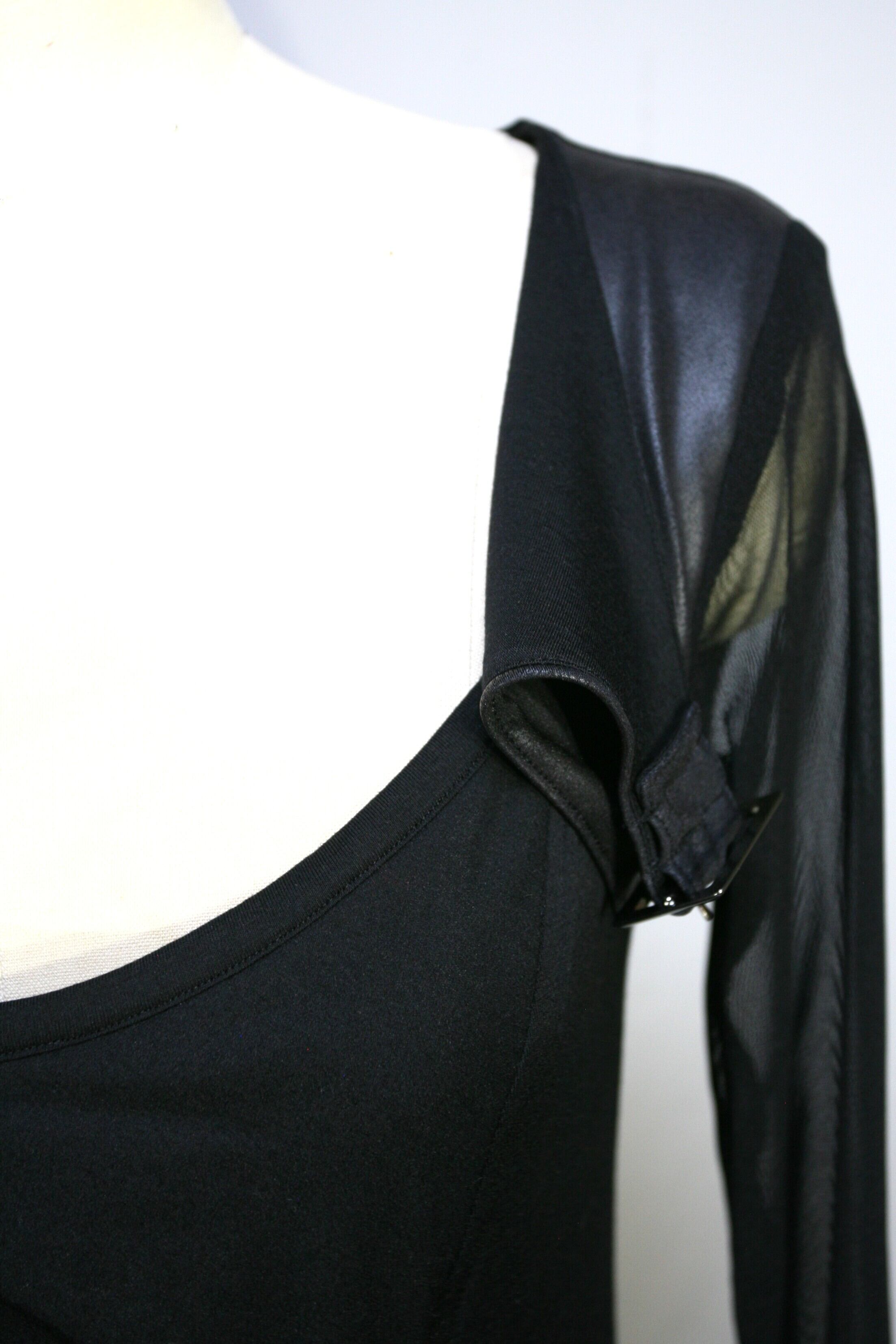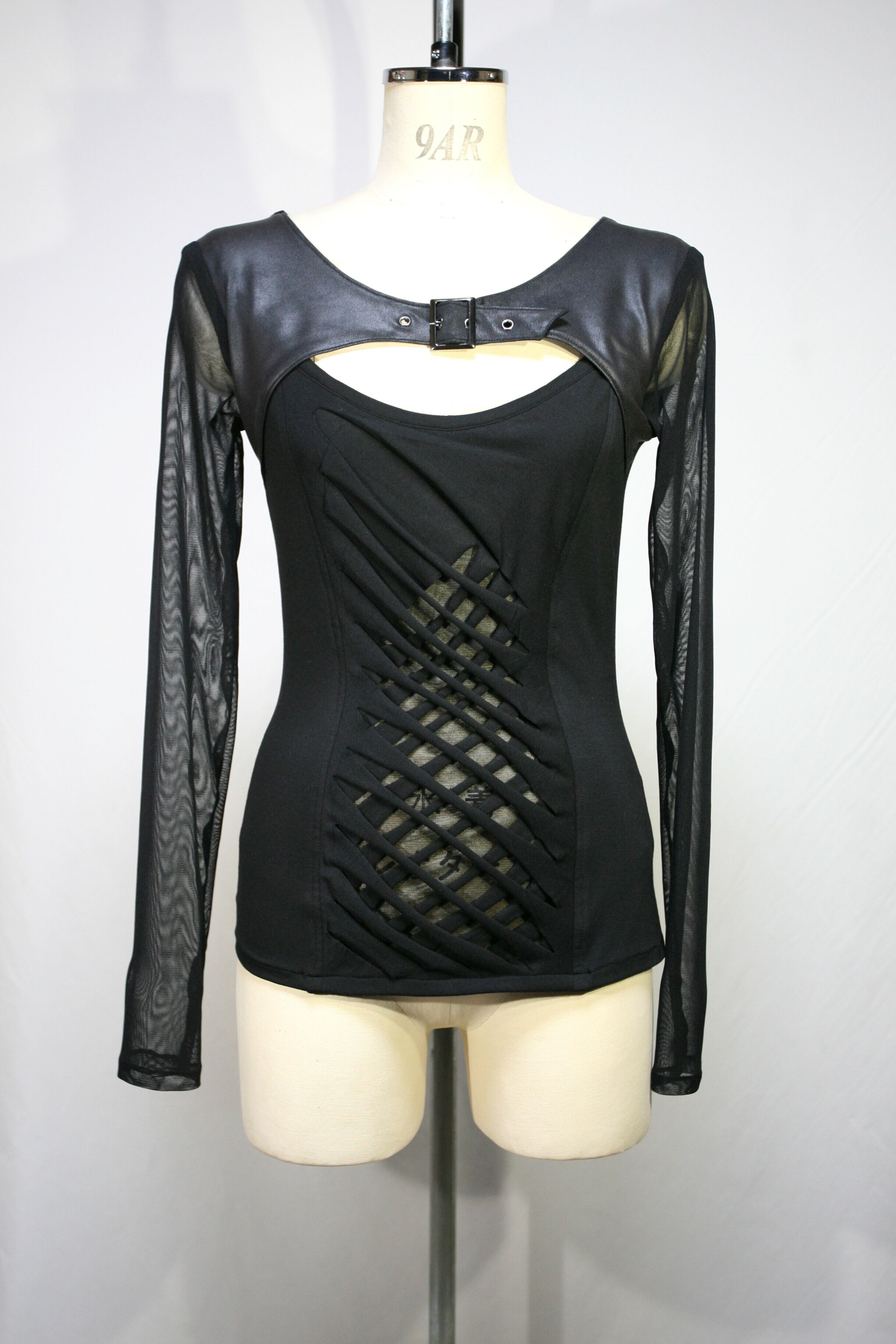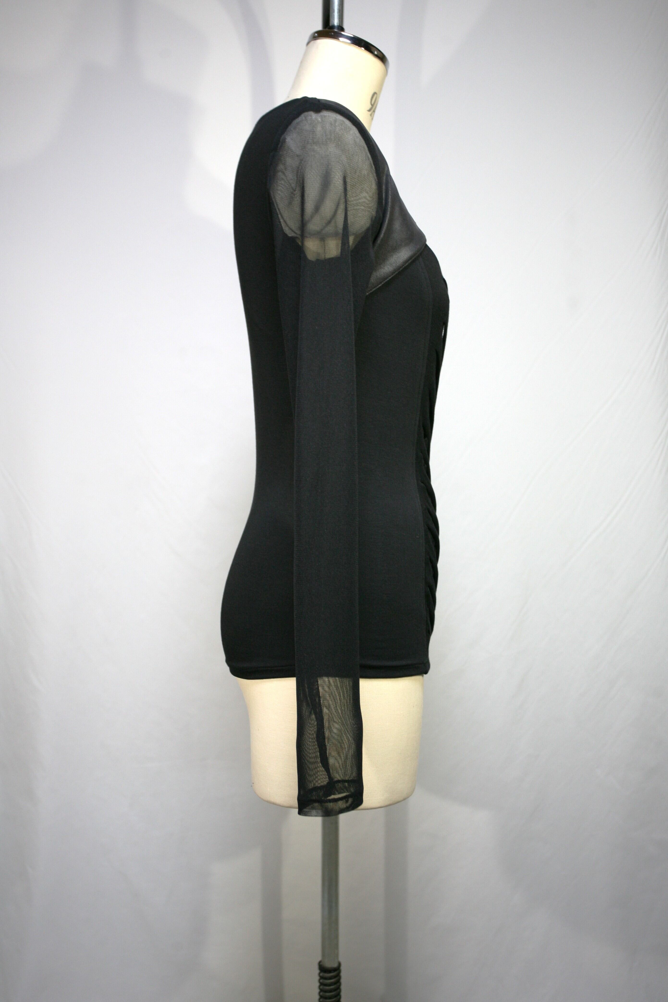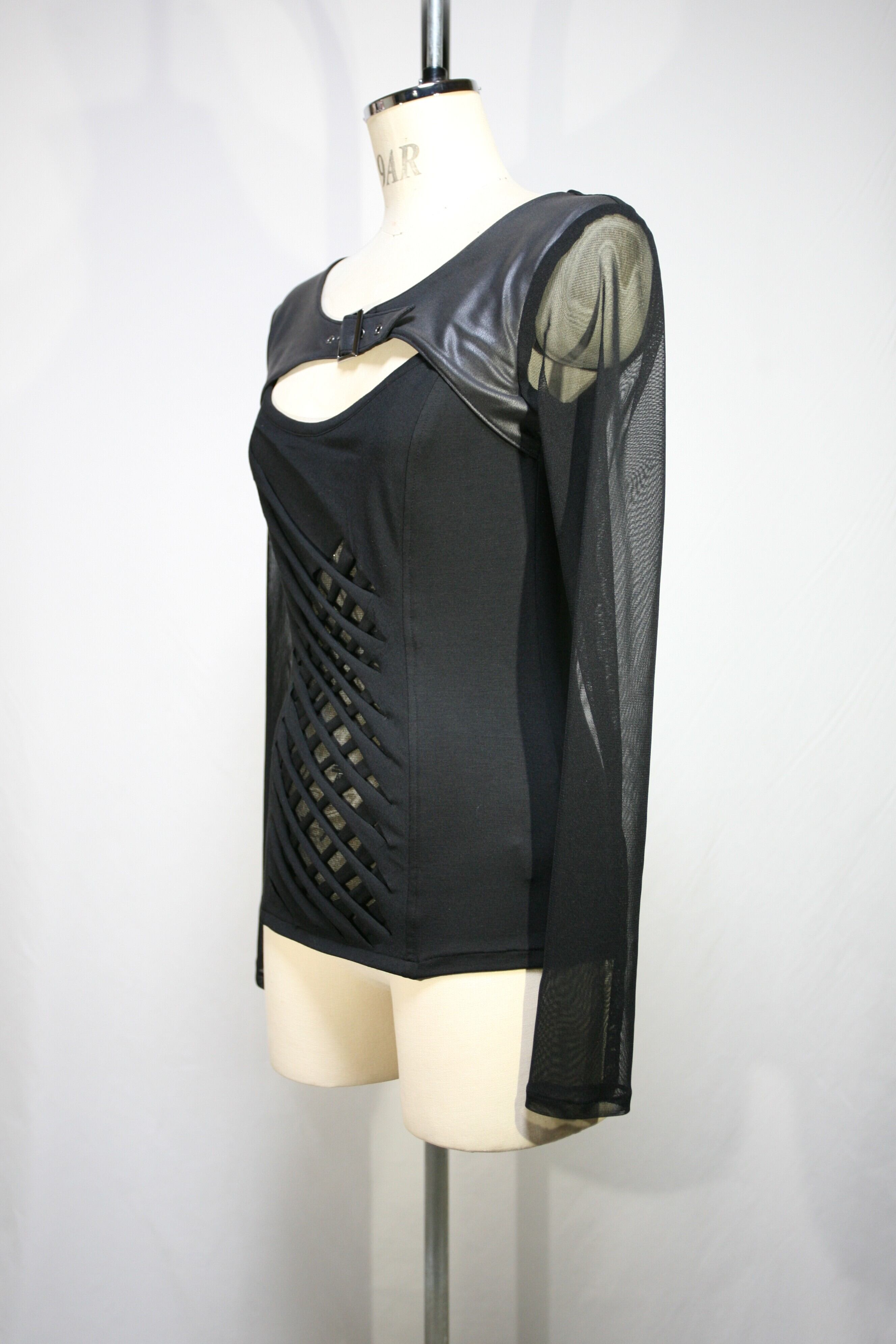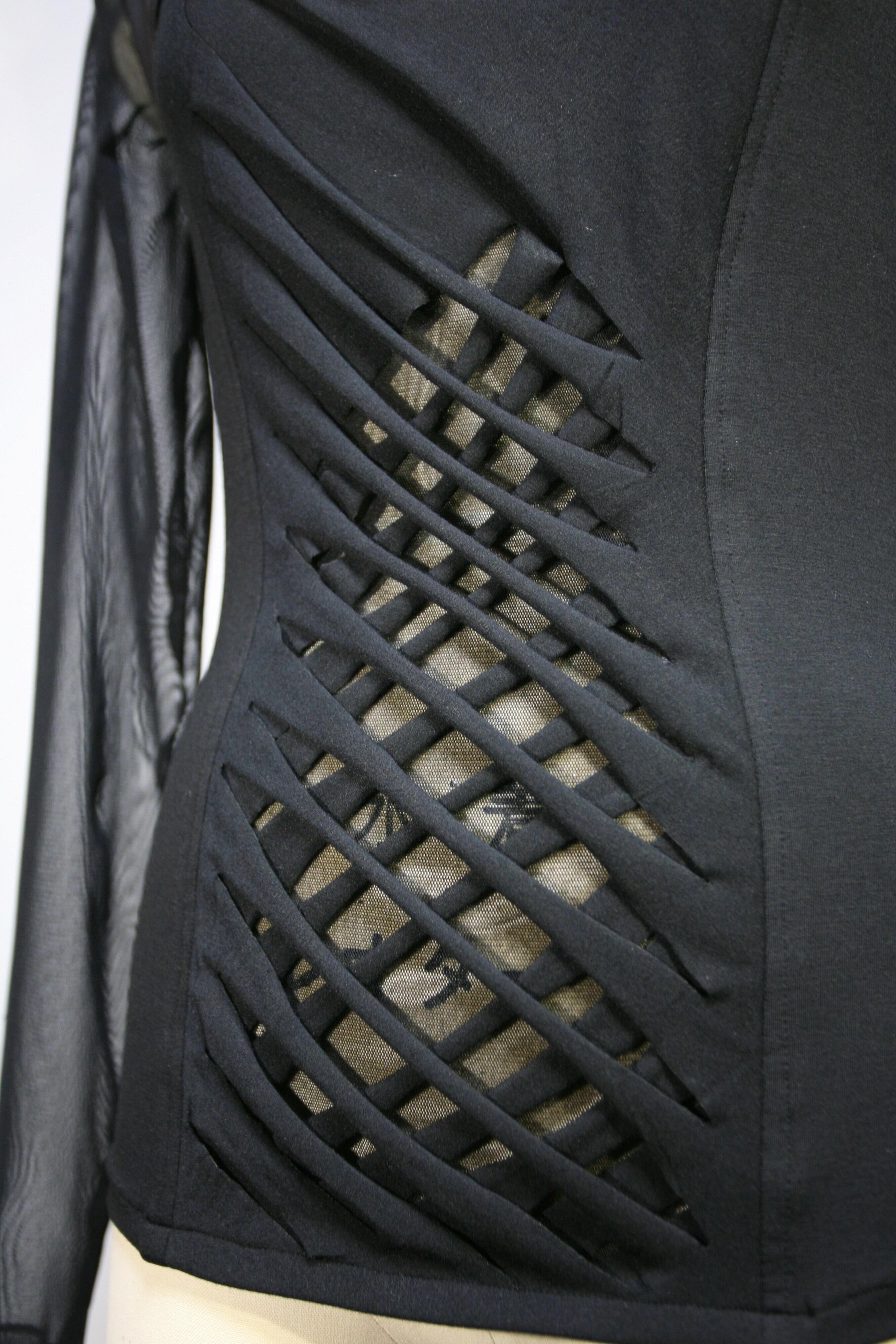 スラッシュ加工して格子状にした表生地をパワーネットに重ねて、前身頃の切り替えに挟んでいます。