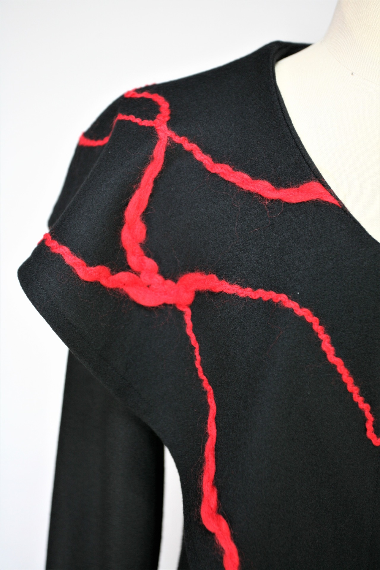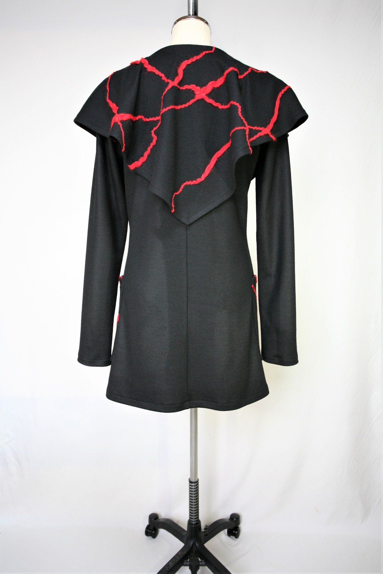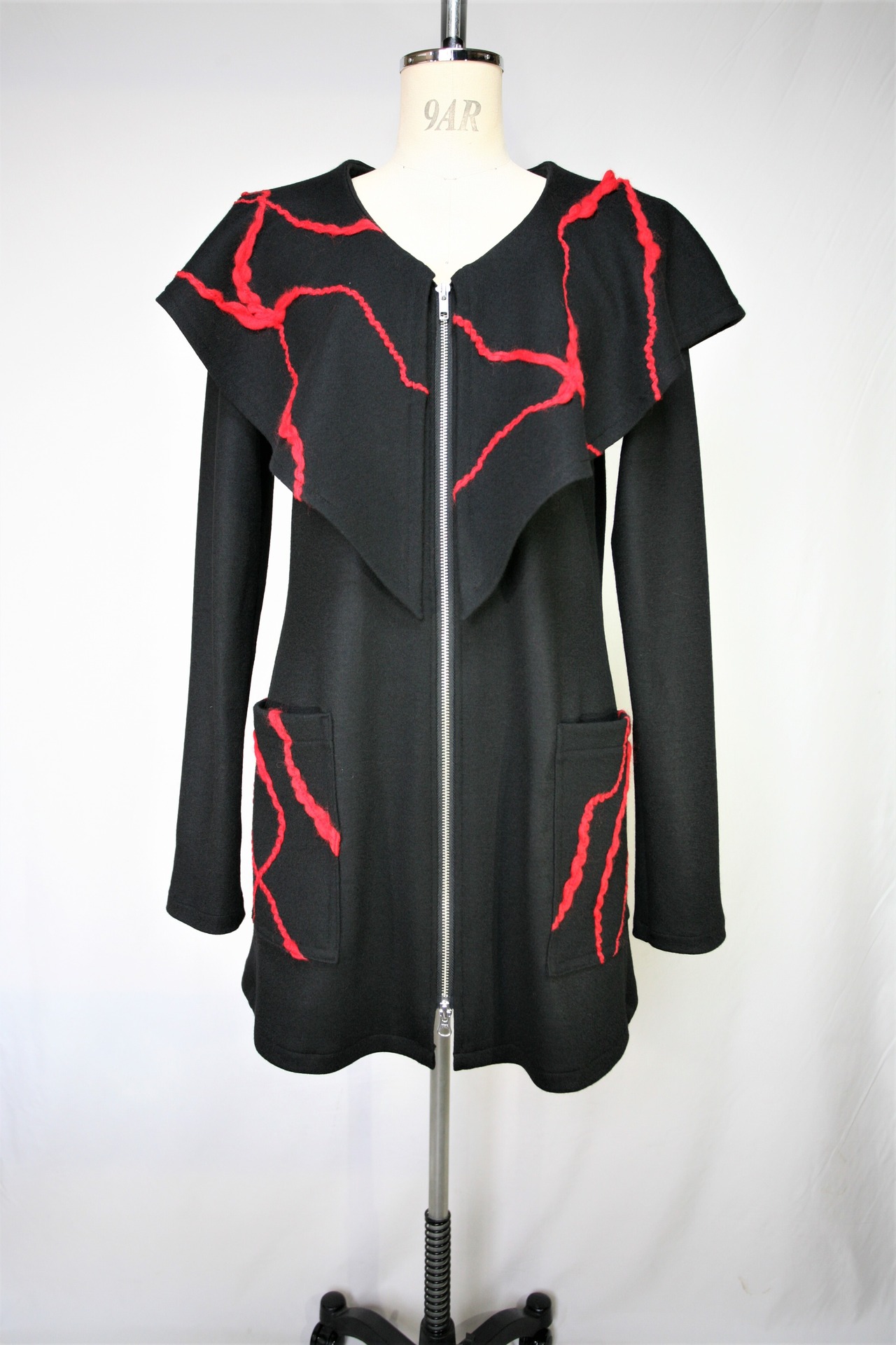 衿とポケットに赤の毛糸をたたき付けています。