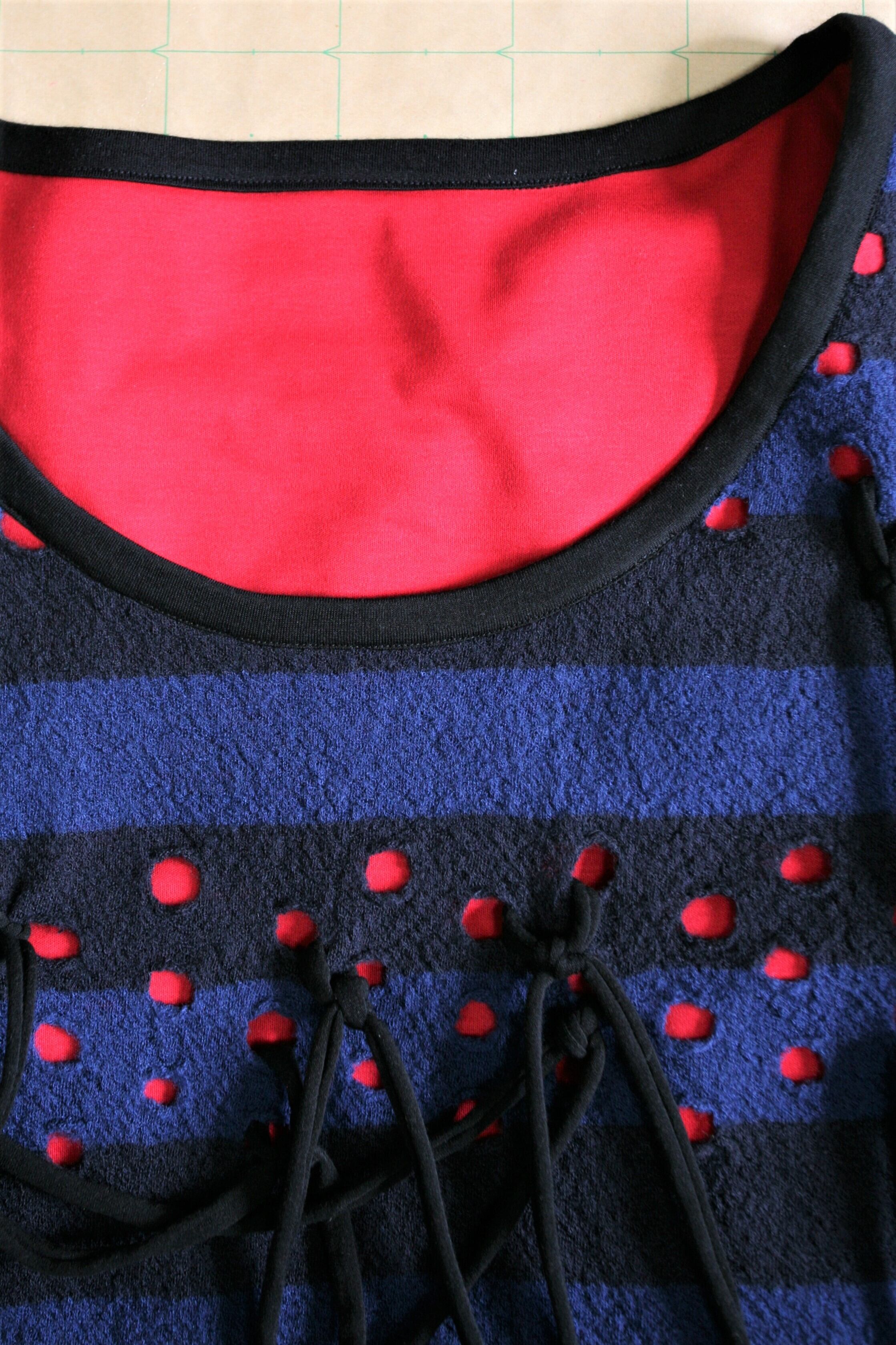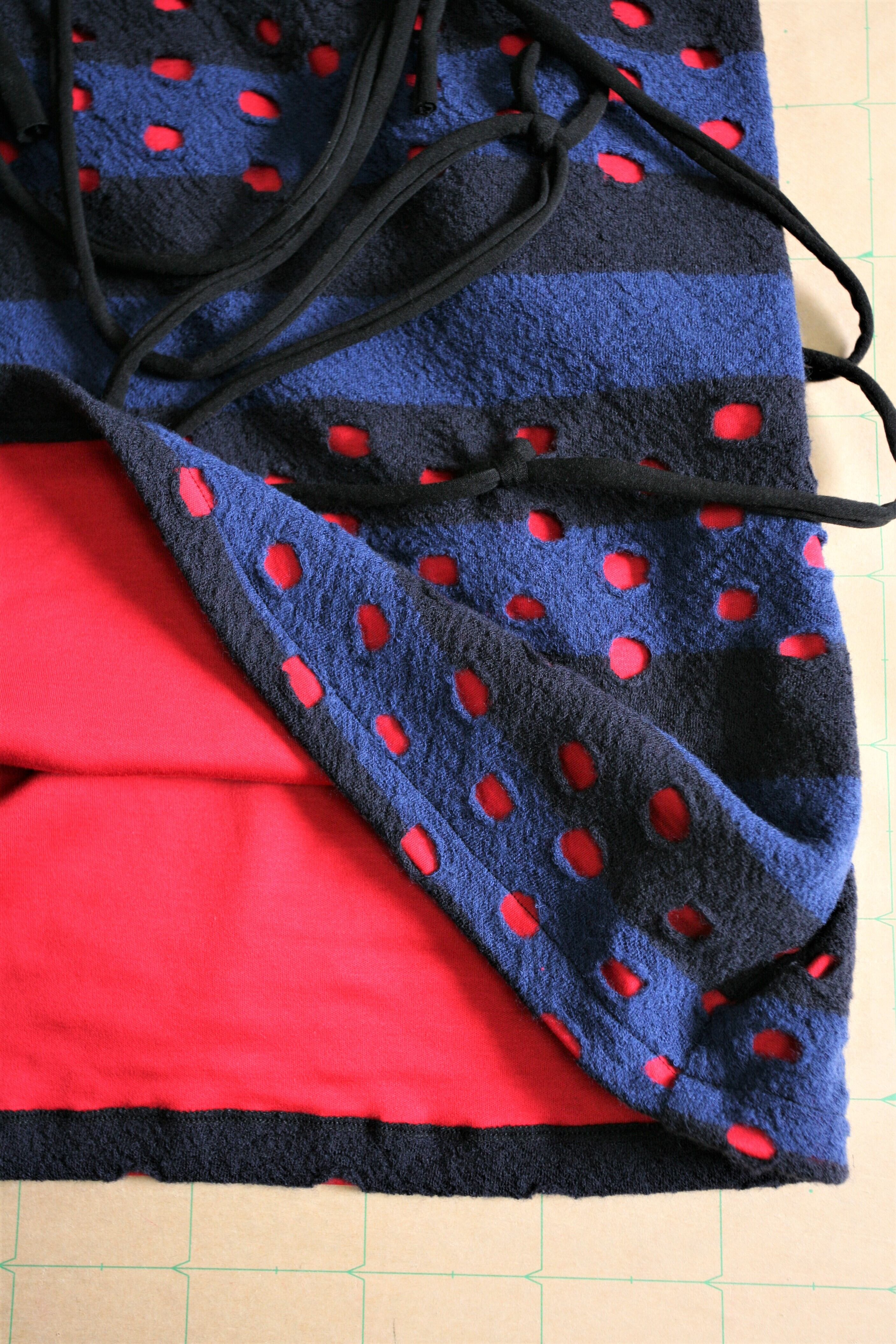 穴の開いたウールニット地の内側に赤の綿天竺を重ねているので暖かいです。