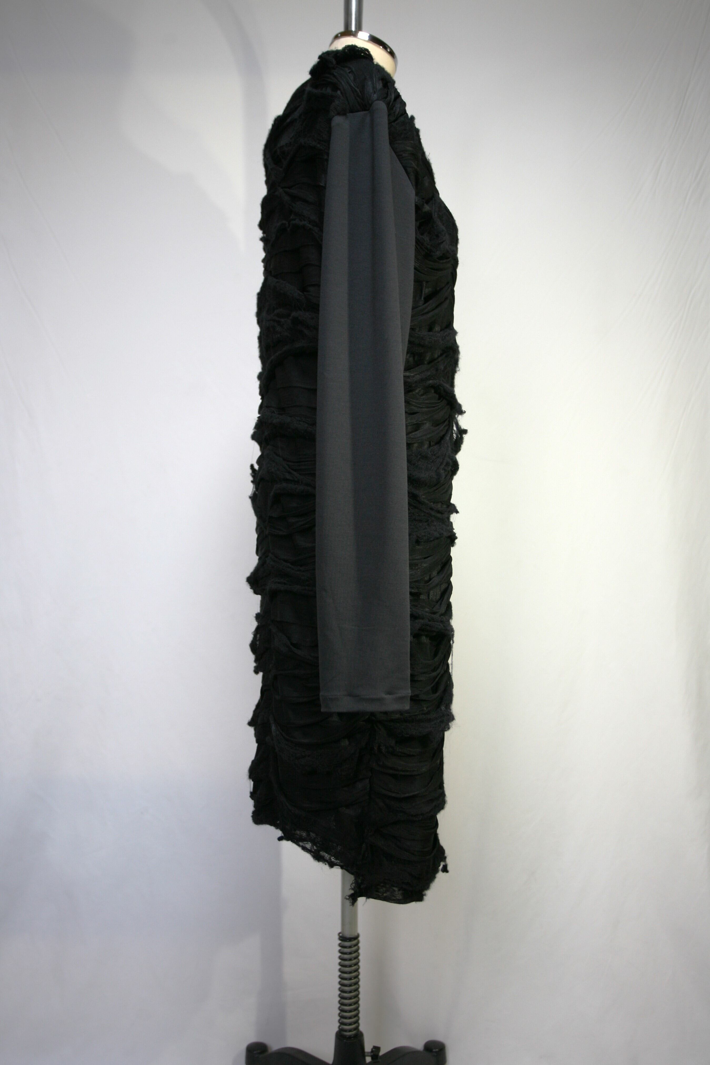 ベア天竺のロングTシャツの前身頃と後身頃にダメージ加工をした横にタックの入った生地を重ねてステッチでおさえています。