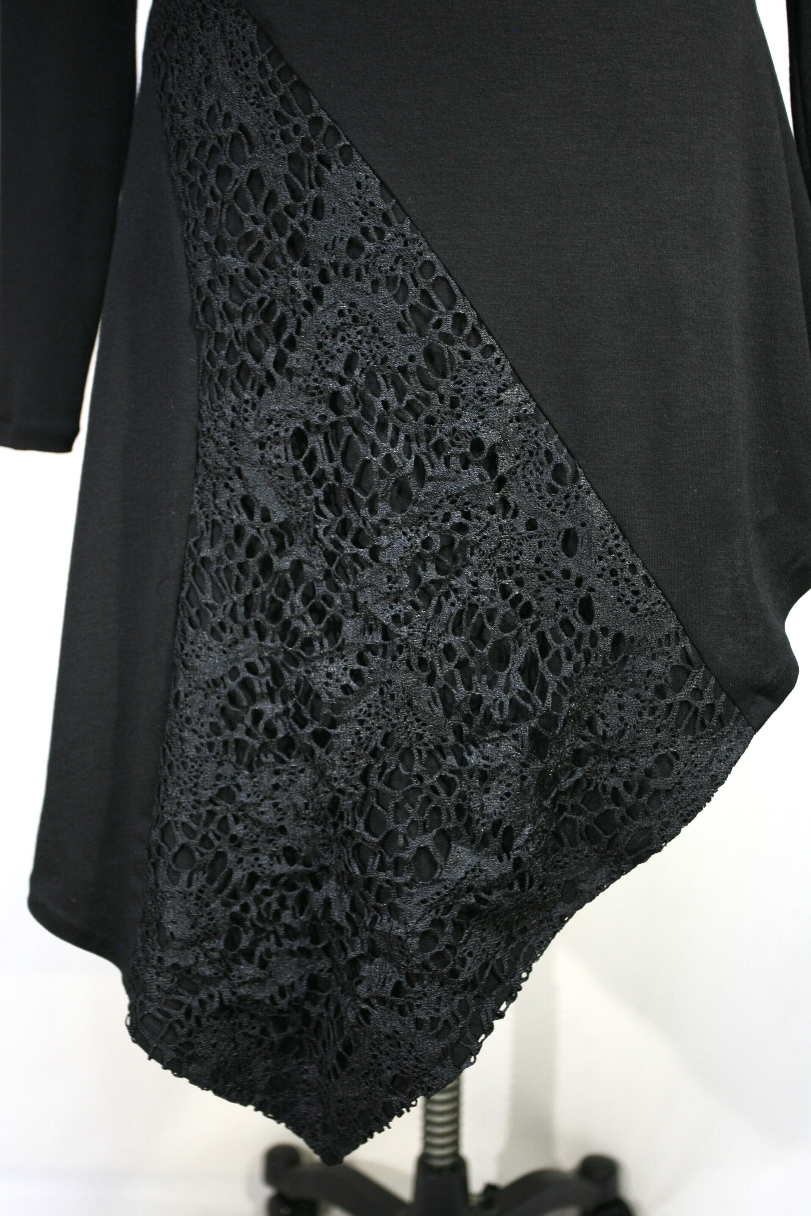 前身頃は、裾にかけて切り替えていて表生地の上に大きな柄のレースを重ねています。