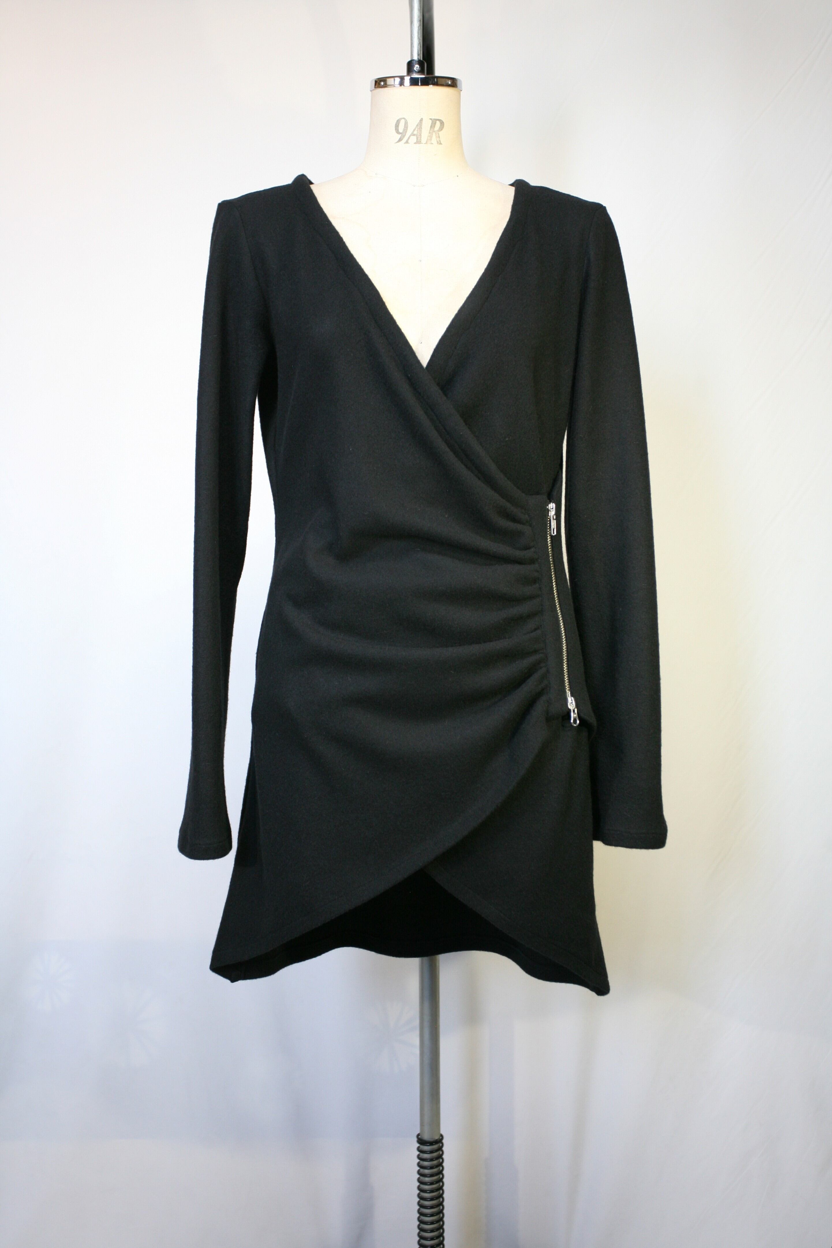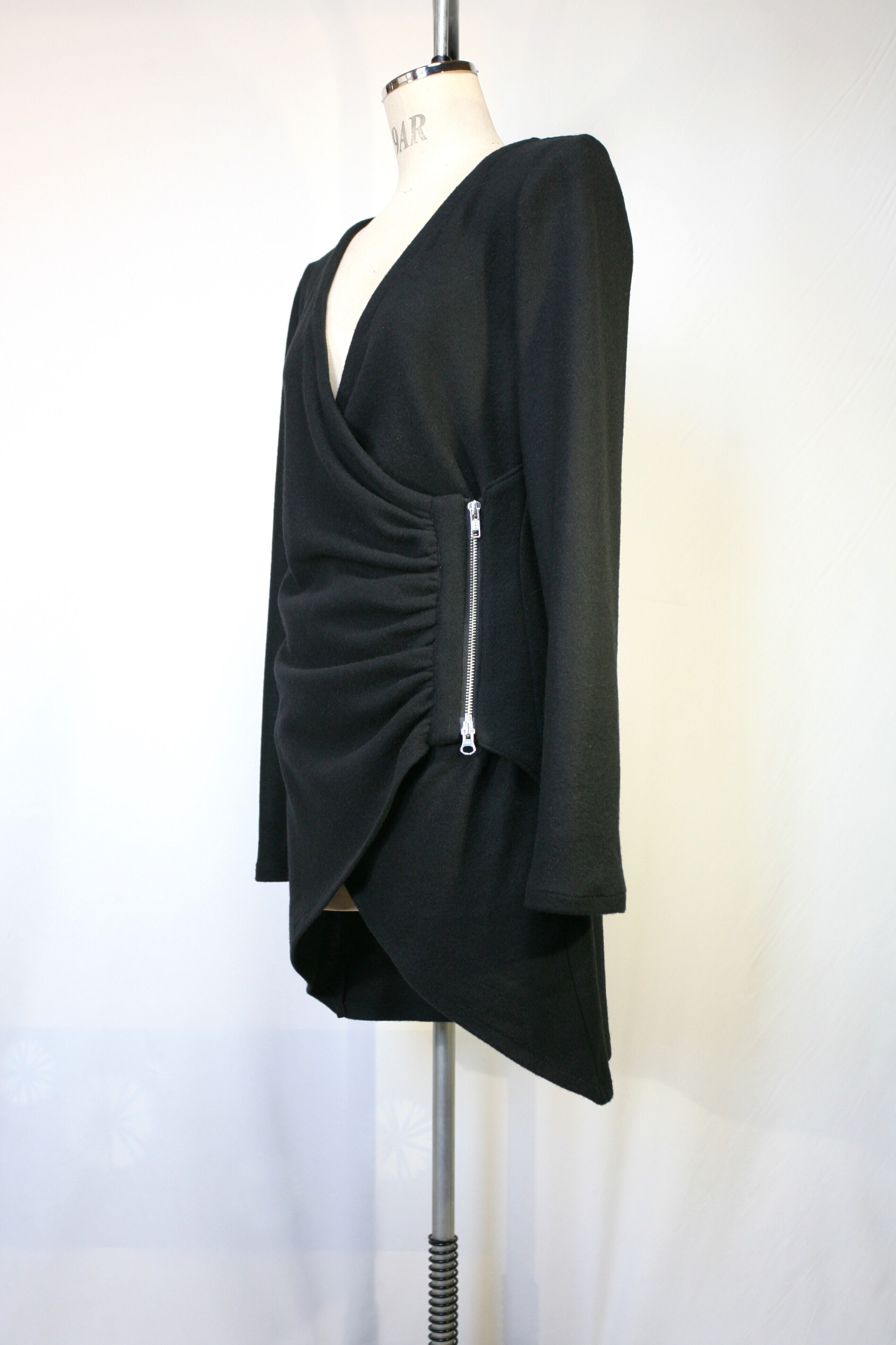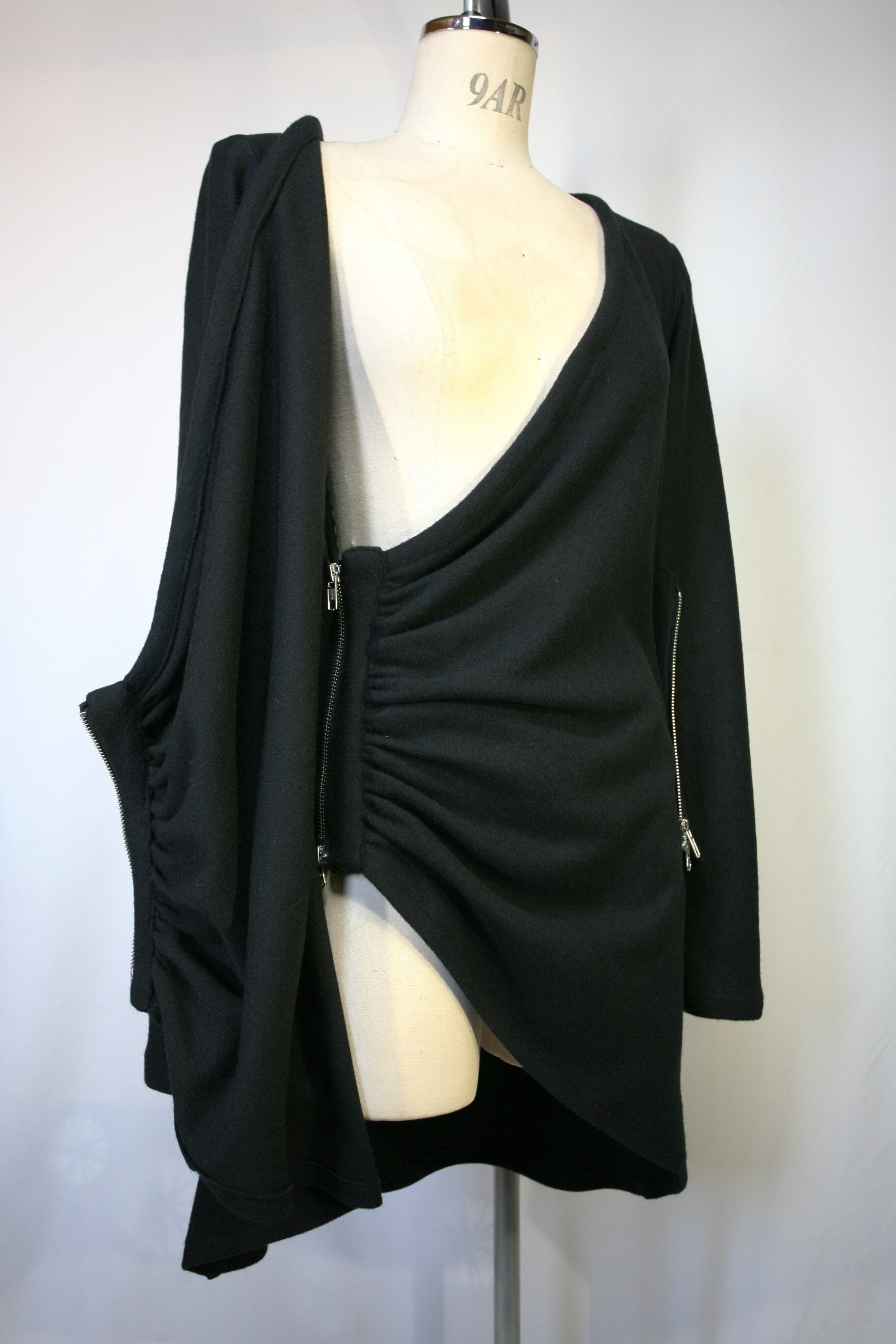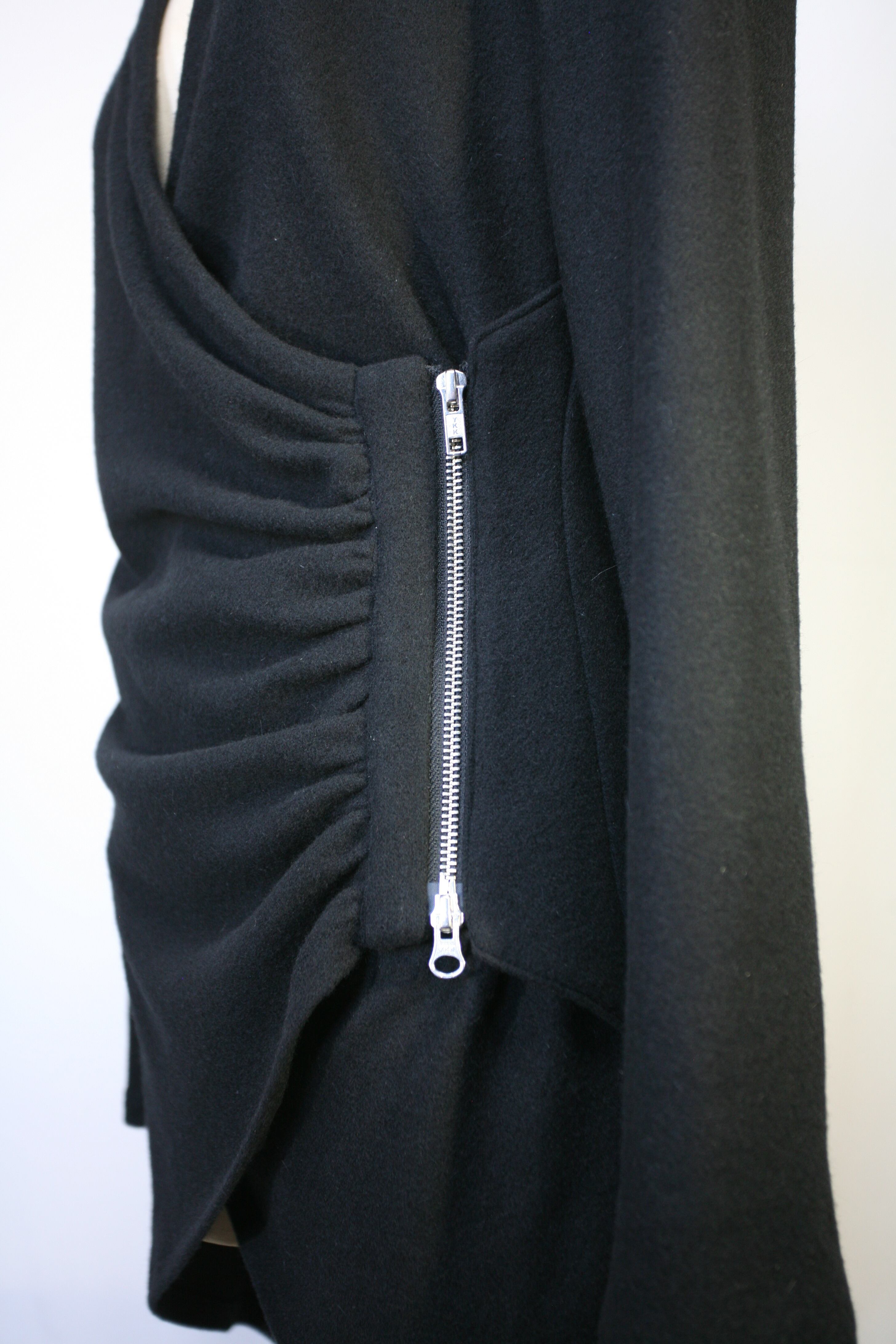 脇の逆開ダブルジッパーを前中心で留める事で、シルエットが随分変わります。