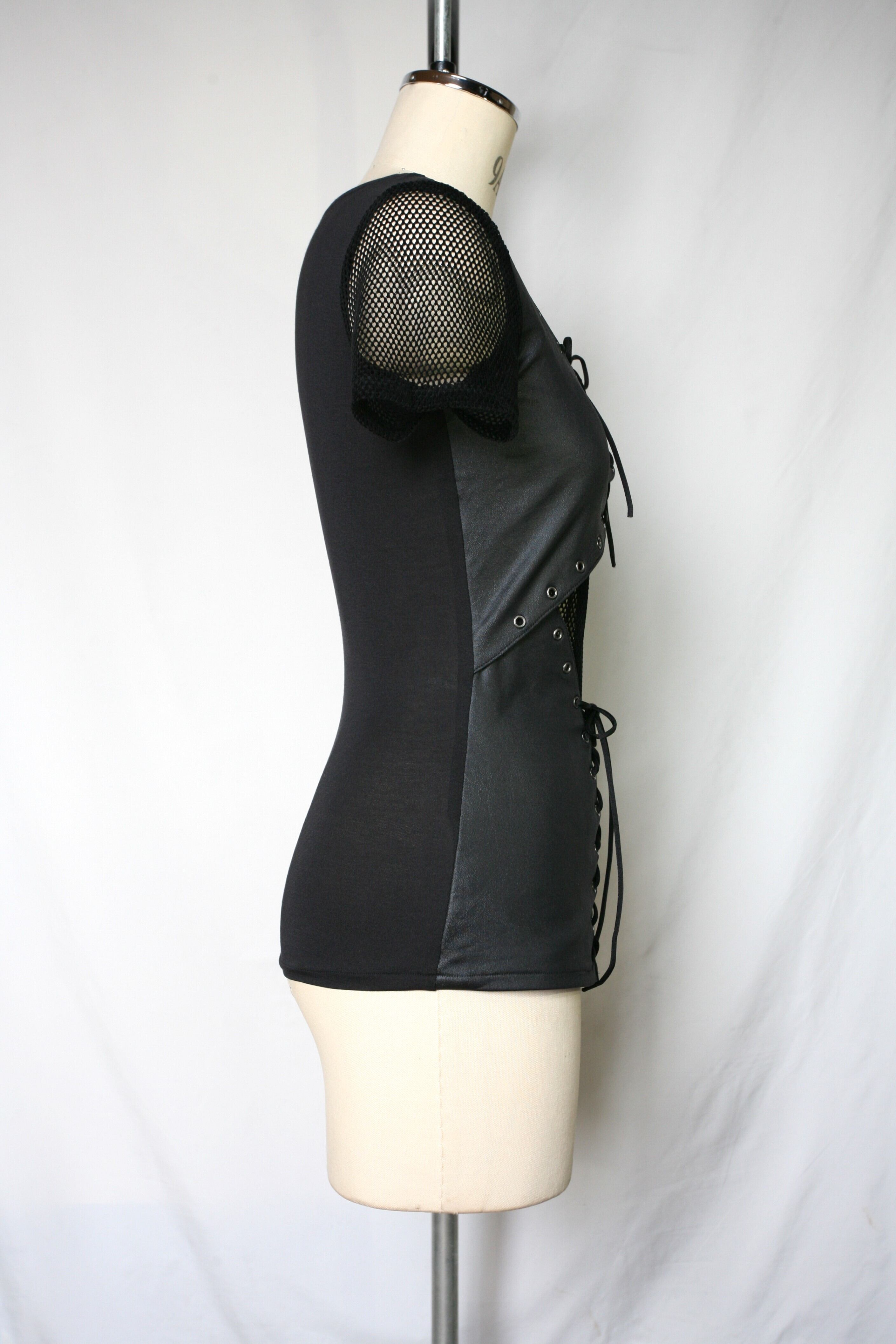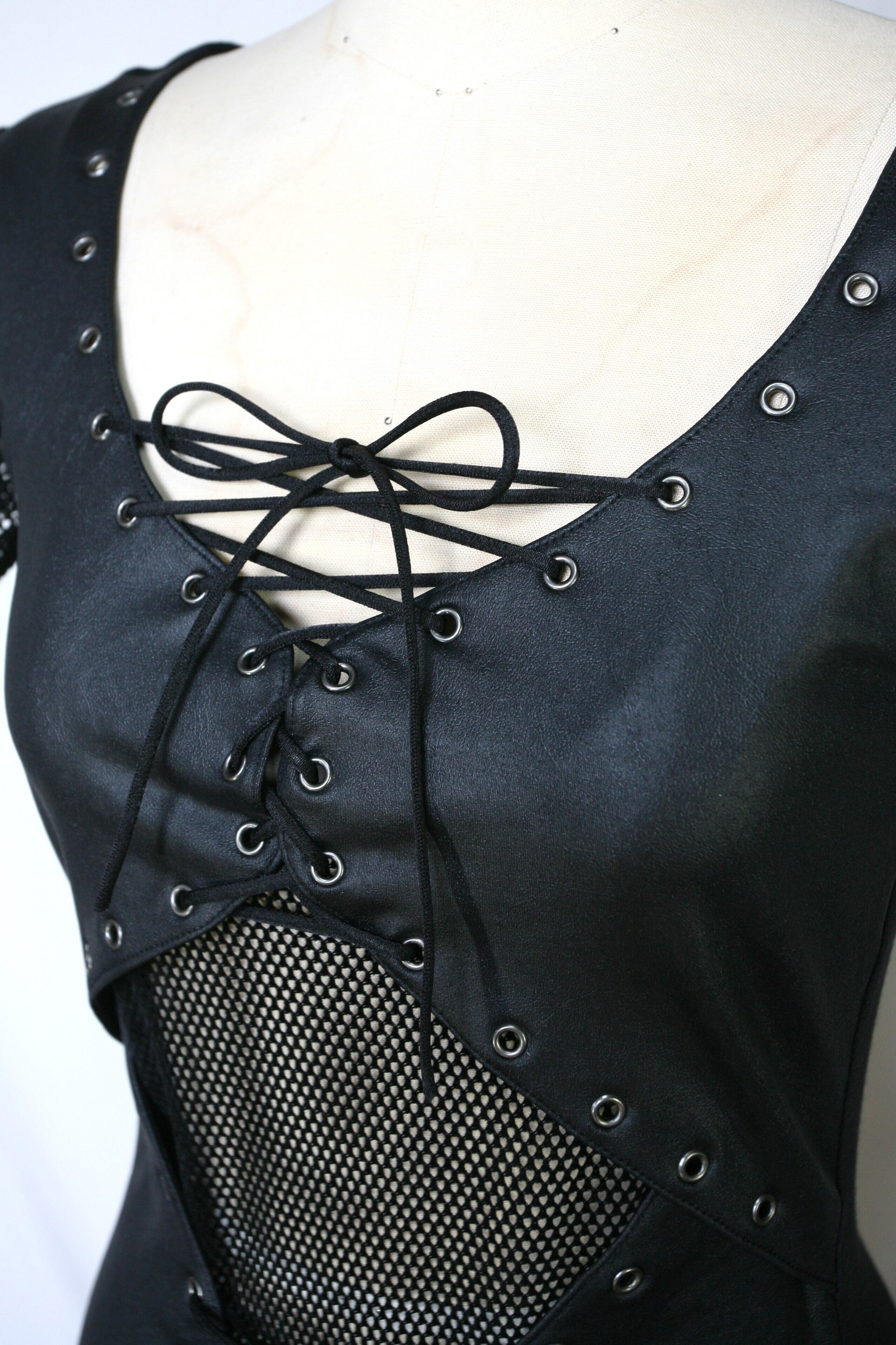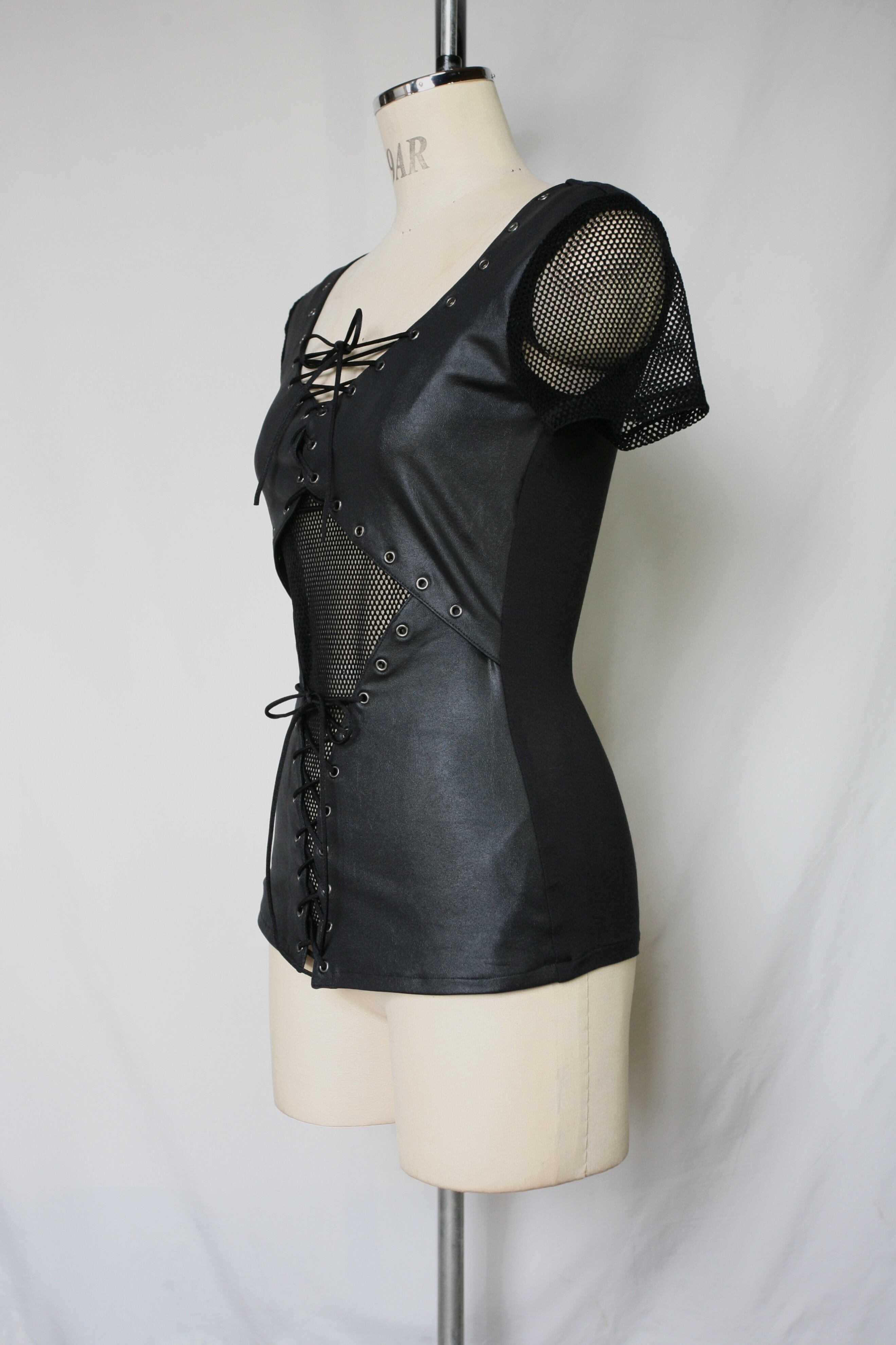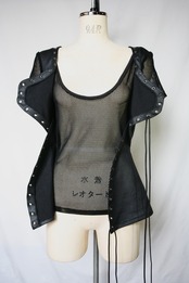 前身頃のメッシ生地のバストとウエスト部分にハトメで編み上げになったウレタンコーティングの生地を重ねています。