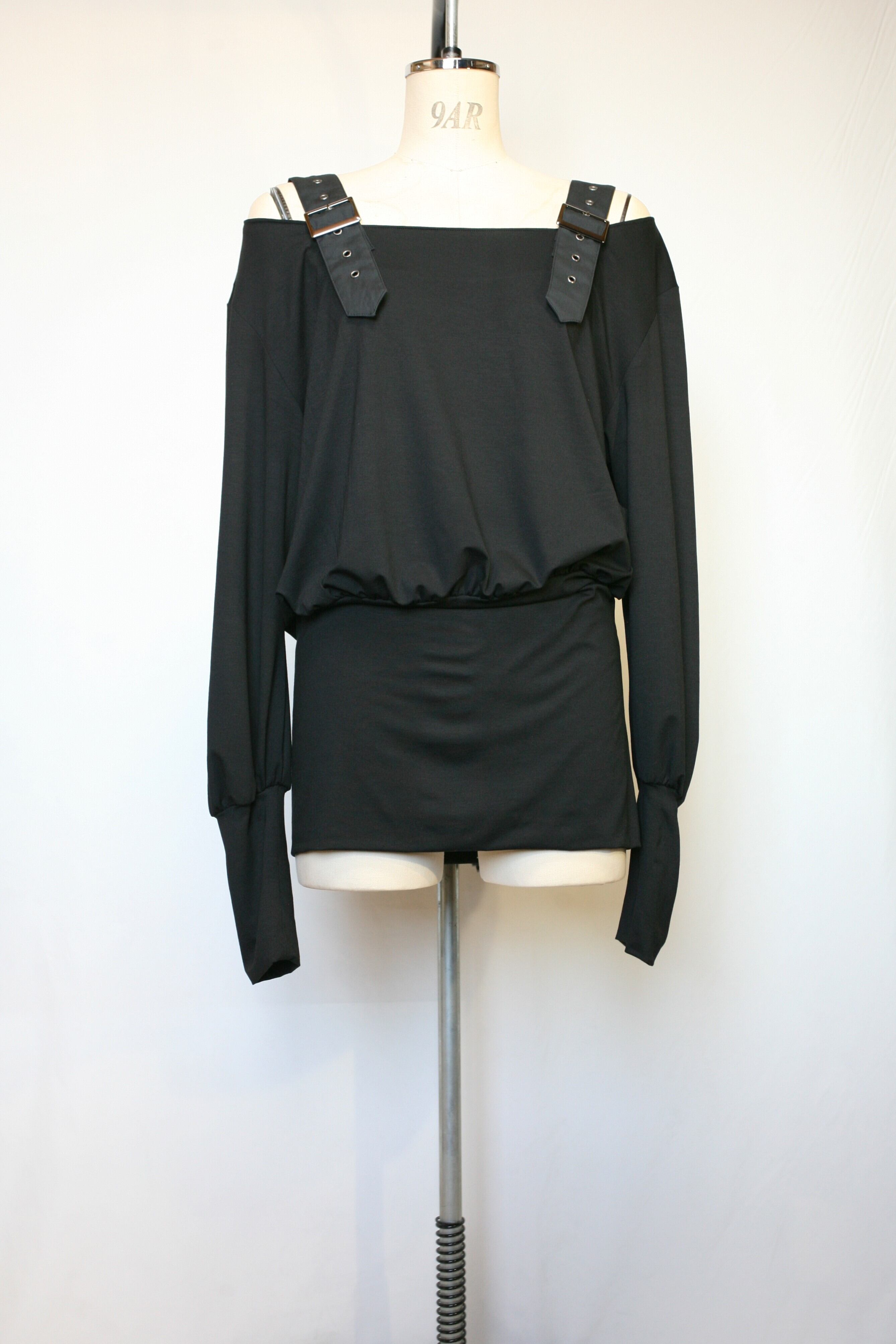 241C168C 肩にベルトが付いた裾と袖口がリブのTシャツ